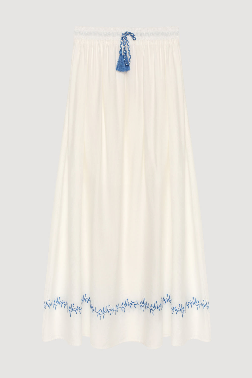 Beli Lastikli Etek Ucu Nakışlı Midi Etek Ekru