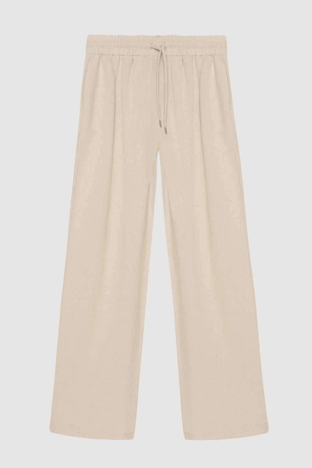Yüksek bel, çift cepli, lastikli bağcık bağlama detaylı, bol paça, modern görünüm sunan keten pantolon.