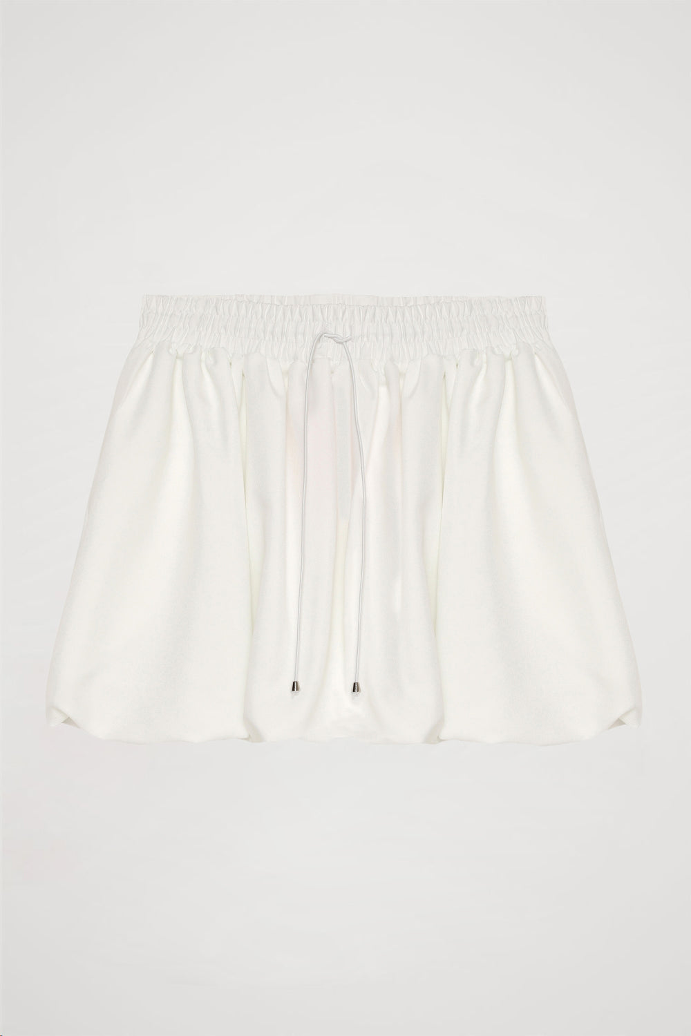 Bel kısmı lastikli ve büzgü detaylı, içi astarlı, çift cepli, günlük ve sportif görünüm sunan mini boy balon etek.