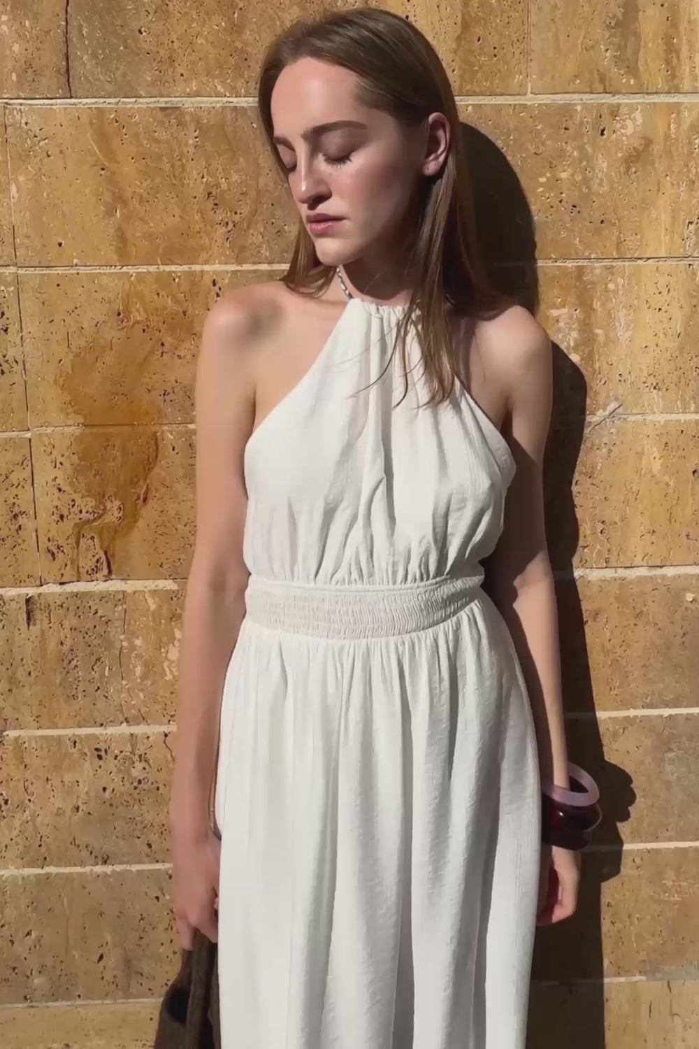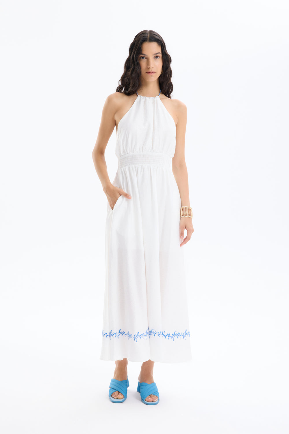 Beli Lastikli Nakışlı Uzun Elbise Ekru
