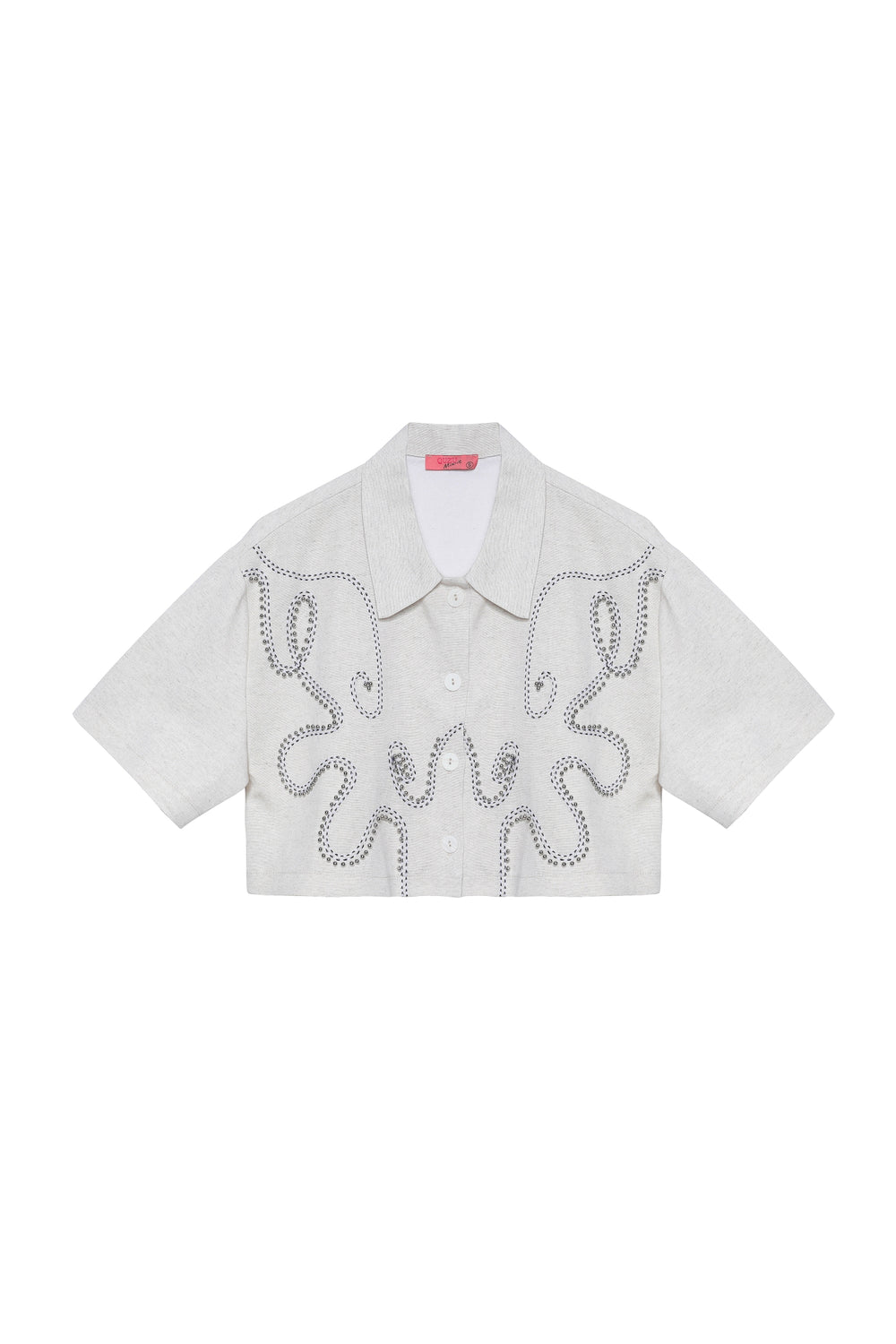 Keten karışımlı, kısa kol, düğme detaylı, crop kesim, boncuk aksesuarlı gömlek.