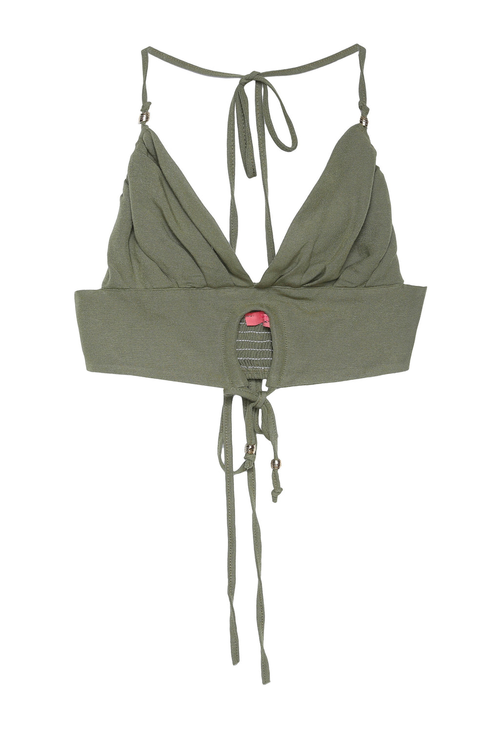 Keten karışımlı, boyundan bağlama detaylı, büzgülü, sırtı dekoleteli, crop bluz.