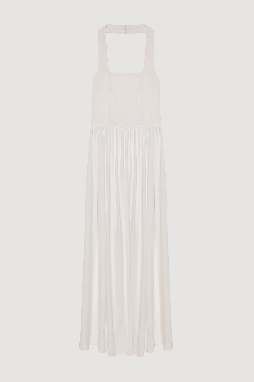 Geniş askılı, yarım astarlı, sırt dekolteli, kare yaka, boyundan düğme kapamalı, yandan fermuarlı, sırtı lastikli, beli büzgü detaylı, uzun boy keten elbise.