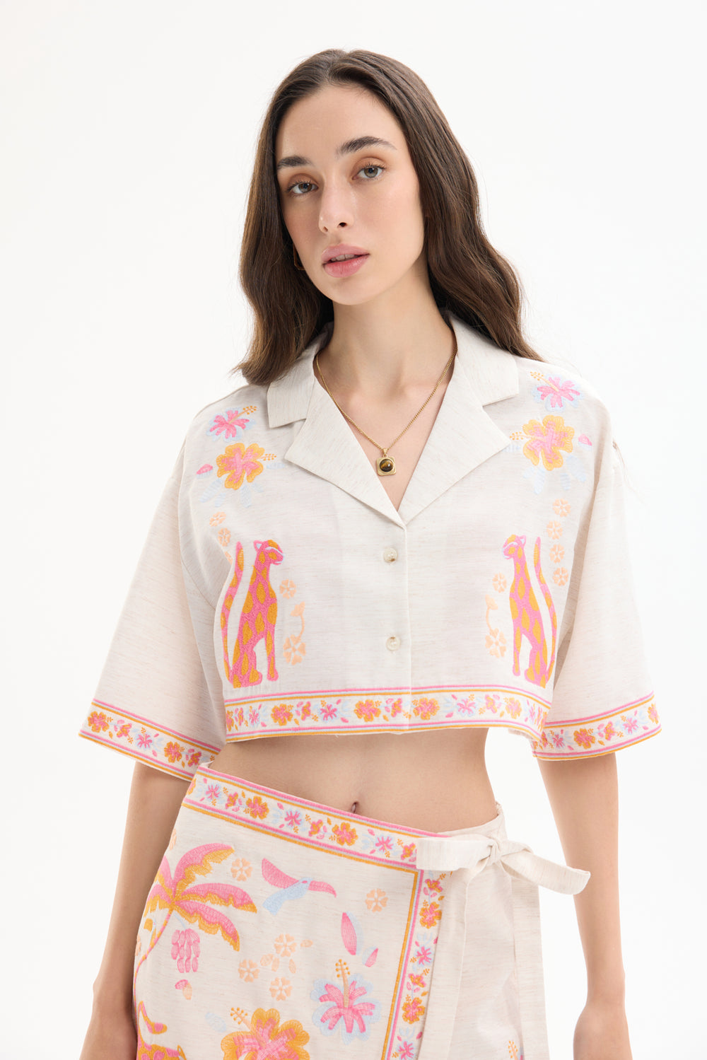 Çita Figürlü Çiçek Nakışlı Keten Crop Gömlek Naturel