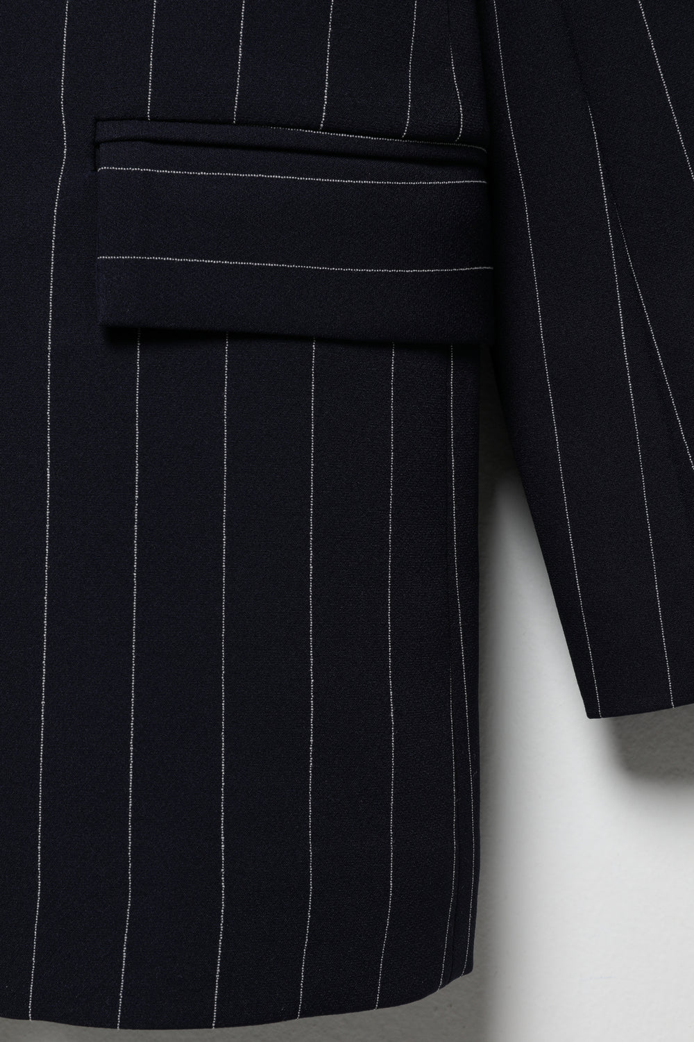 Blazer jacket with pinstripe, double-breasted collar, concealed pockets, inner lining.