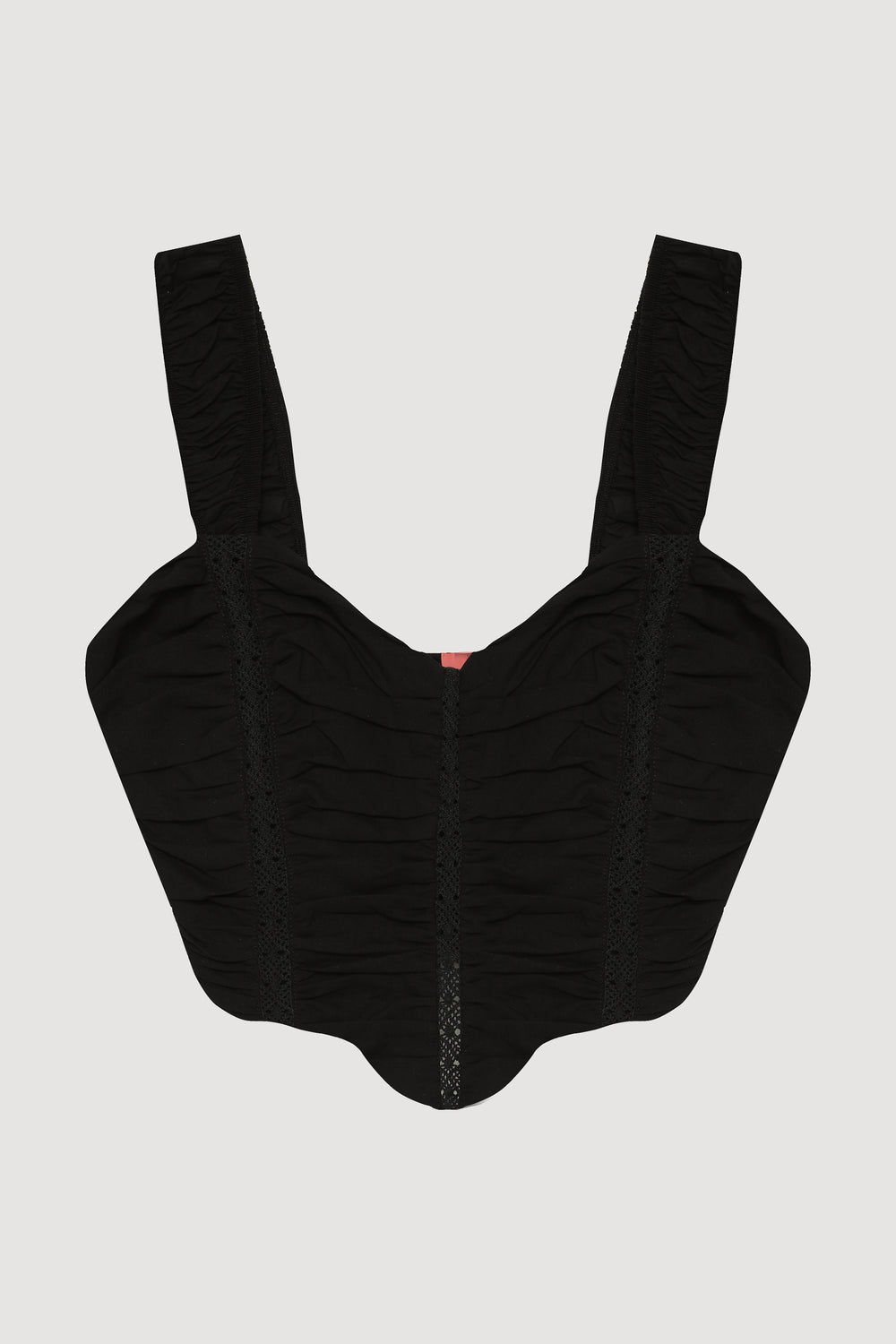 Kalın askılı, v yaka, drape ve dantel detaylı, sırtı lastik görünümlü, vücuda oturan korse formunda crop bluz.