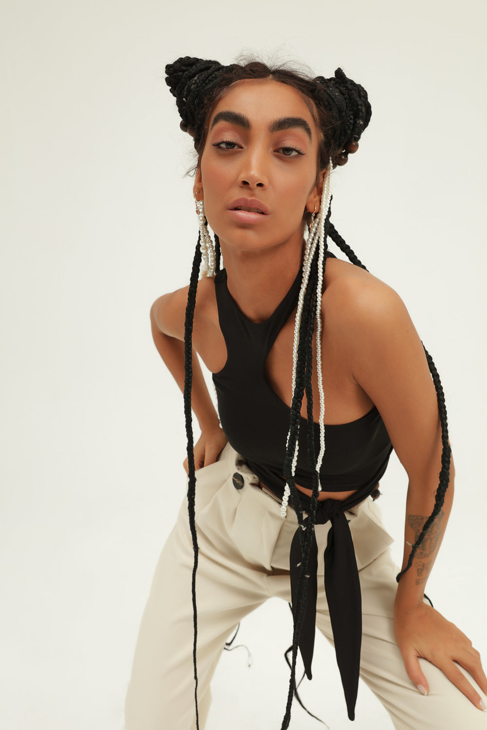 Crop blouse with asymmetrical cut straps, can be tied optionally with the belt rope detail at the waist.