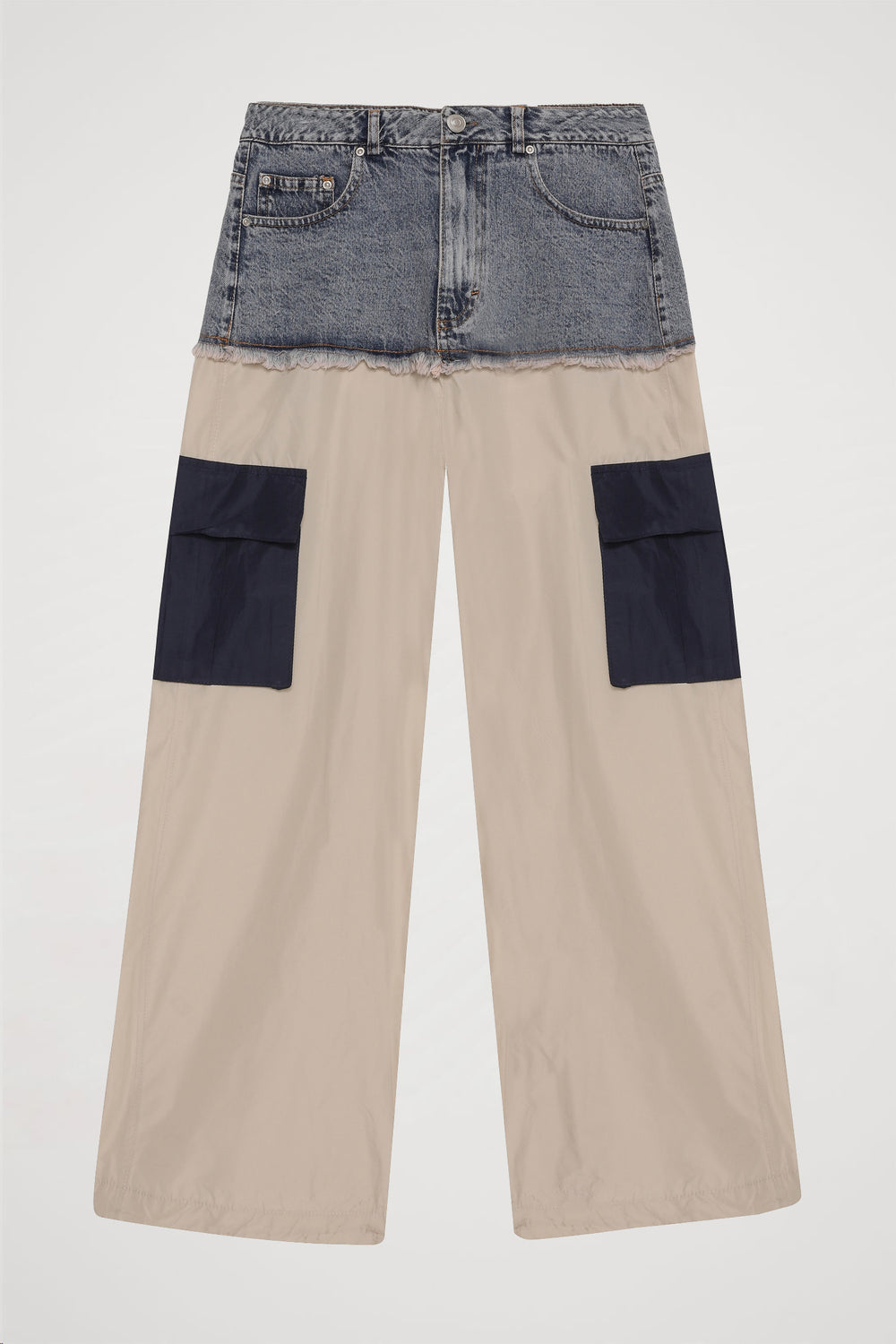 Denim ve kontrast kumaş detaylı, yanı cepli, yüksek bel, fermuar ve düğme kapamalı, geniş paça, paraşüt görünümlü günlük ve spor pantolon.