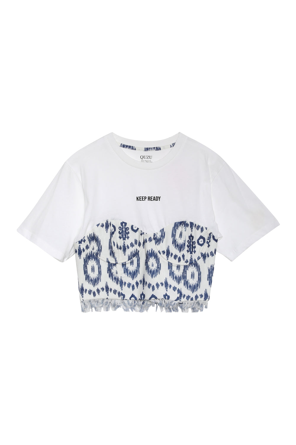 Desenli kumaş match detaylı, önü baskılı, bisiklet yaka, kısa kollu tişört.