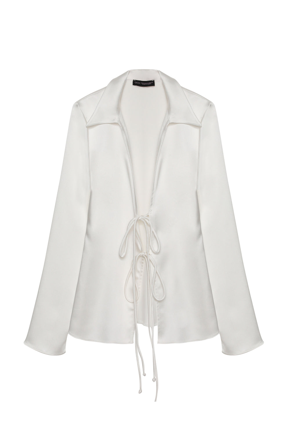Bağlama Detaylı Dekolteli Saten Bluz Ekru