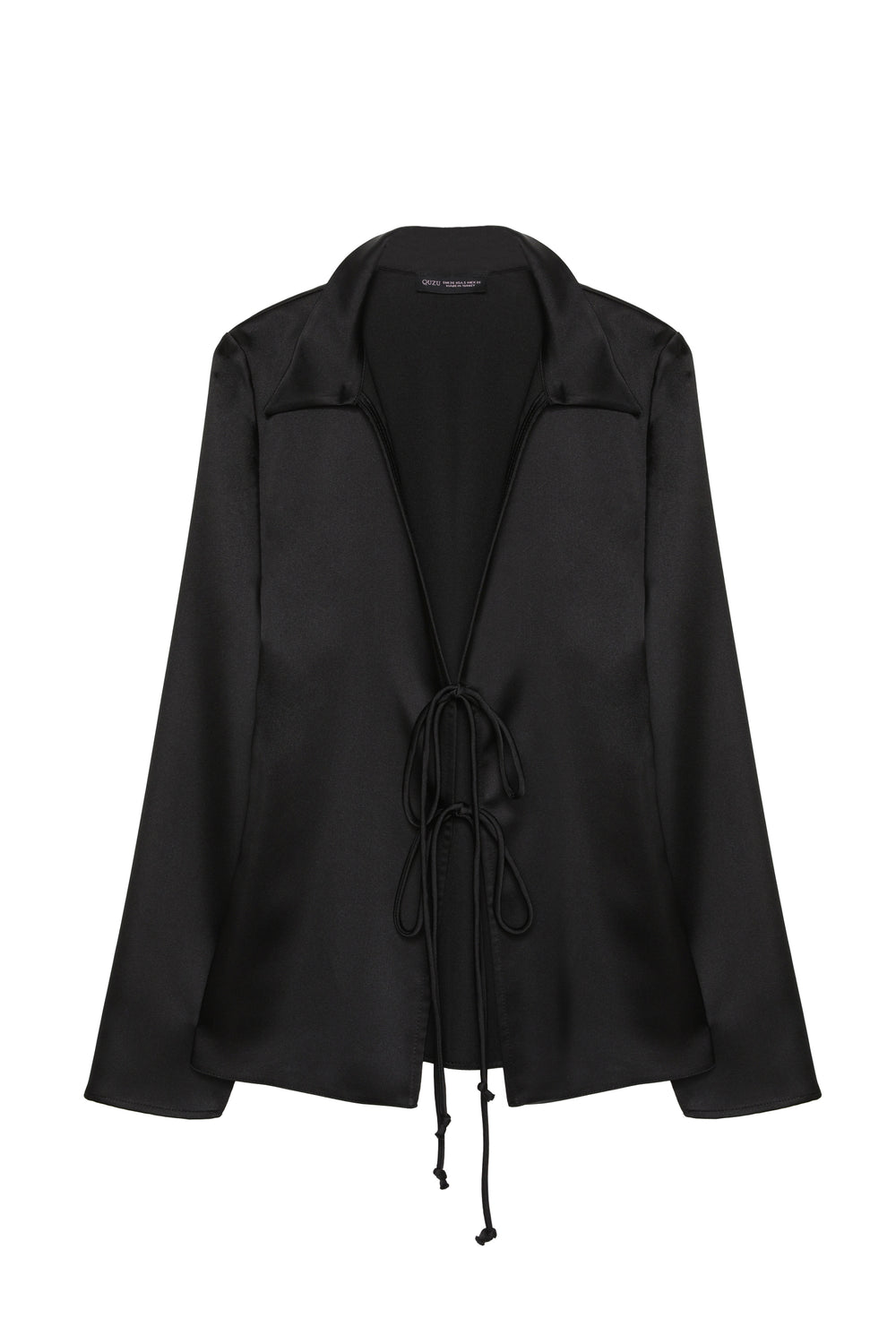 Bağlama Detaylı Dekolteli Saten Bluz Siyah
