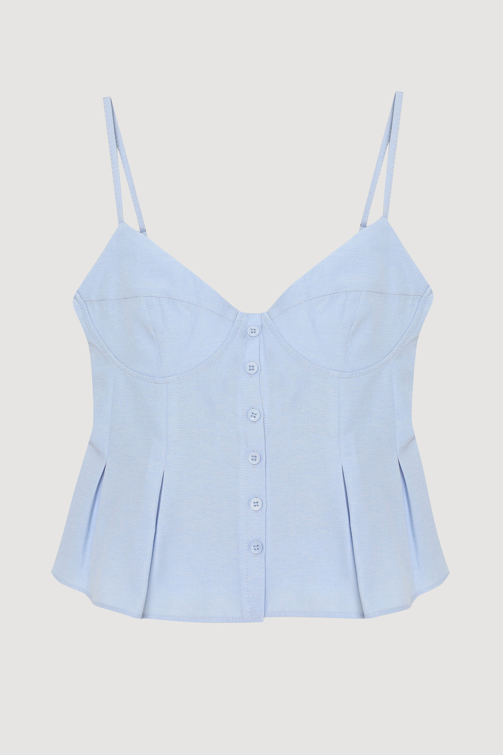 Pile Detaylı Düğmeli İnce Askılı Bluz Mavi