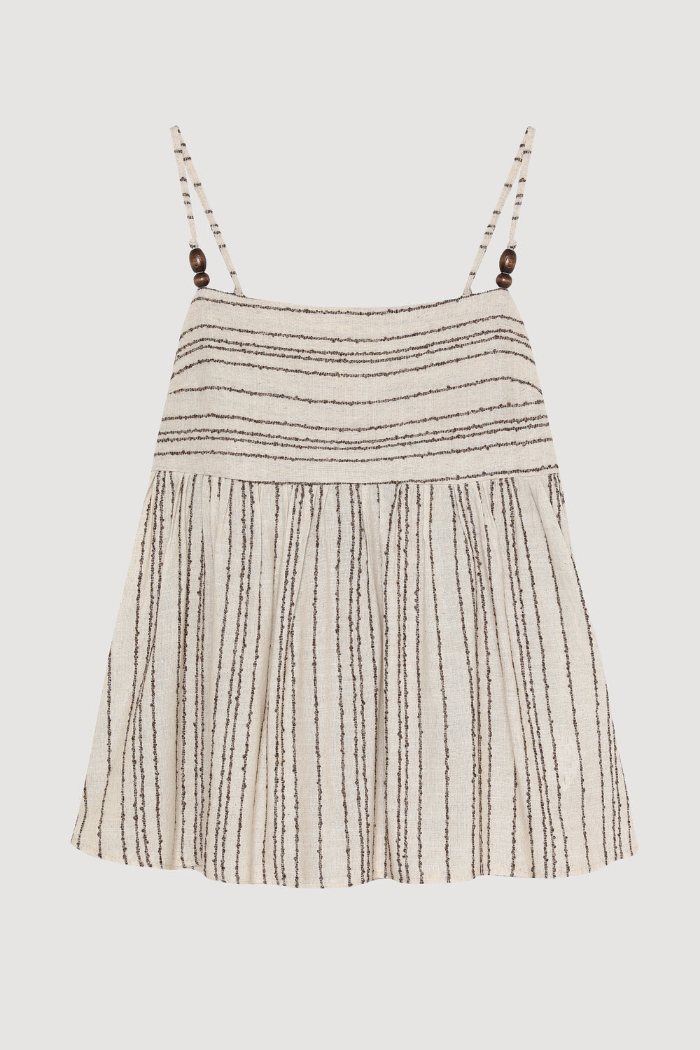 Boncuk detaylı ayarlanabilir ince askılı, sırtı fiyonk bağlamalı, sırt kısmı lastikli, ince çizgili keten bluz.