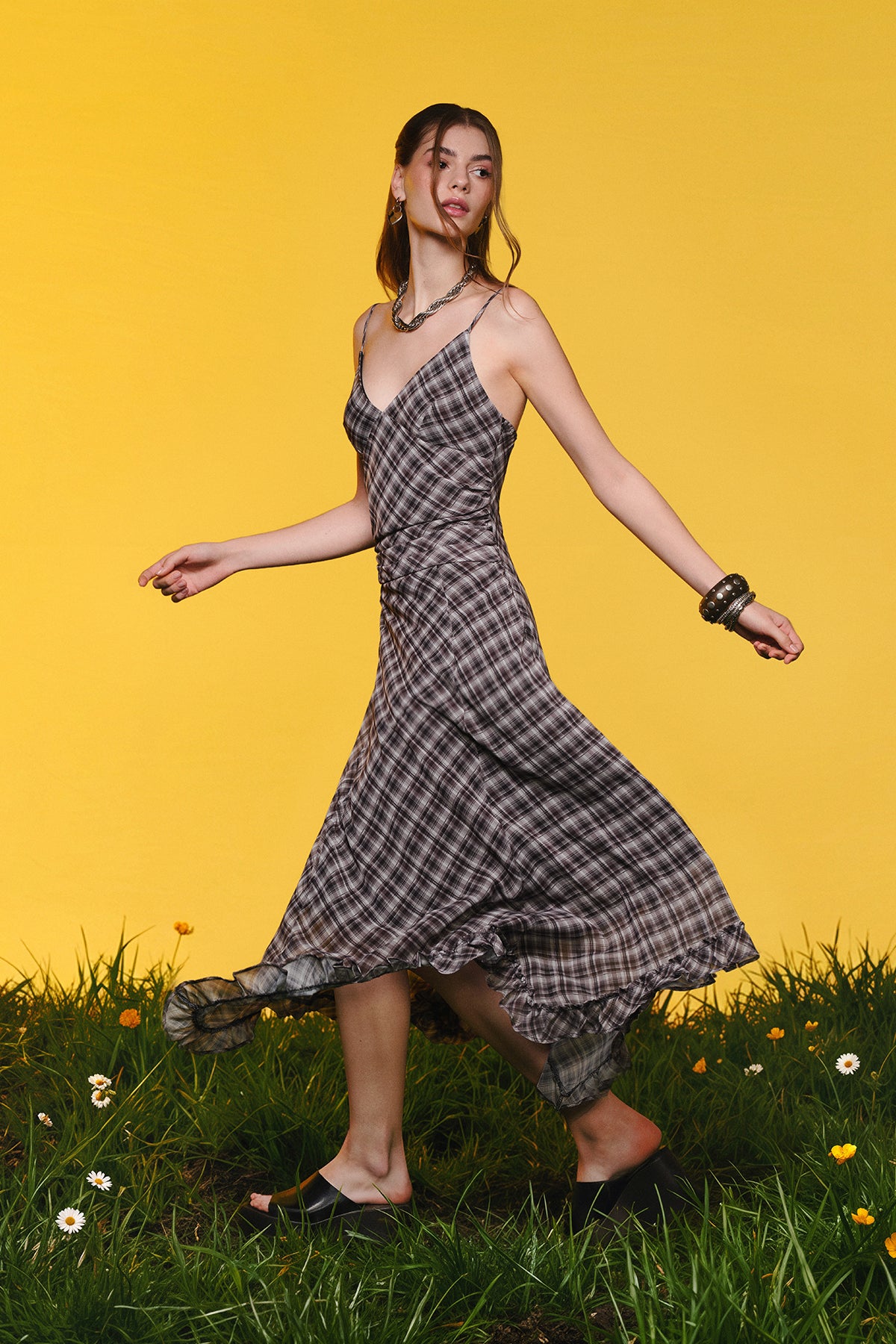 Asimetrik Drapeli Ekose Midi Elbise Siyah