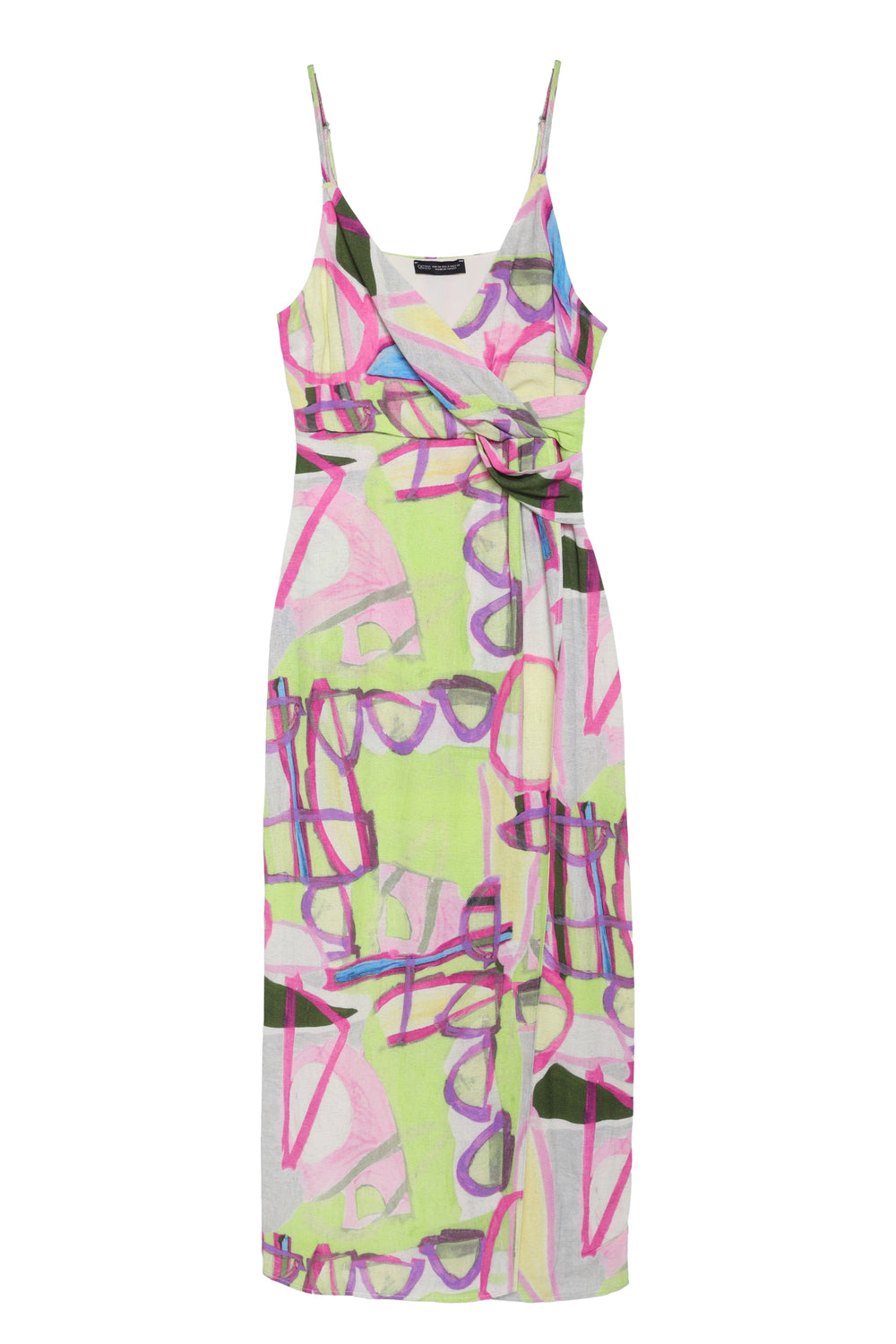 Keten karışımlı, v yaka, desenli, ince askılı, midi boy, anvelop elbise.