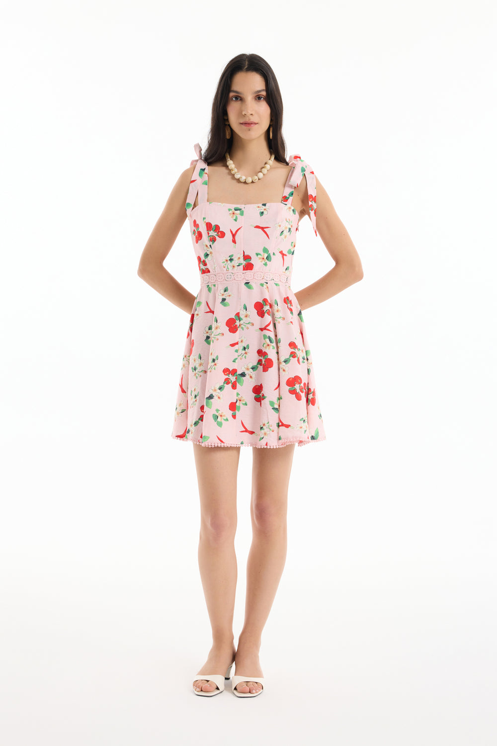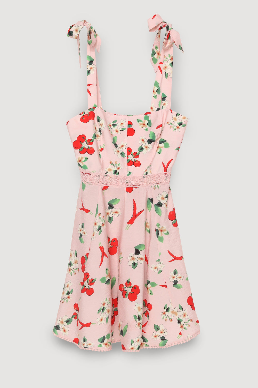 İçi astarsız, fiyonk bağlamalı kalın askılı, yandan fermuar kapamalı, çiçek ve meyve desenli, etek ucu ve beli dantel detaylı, kloş kesim piliseli, mini boy elbise.