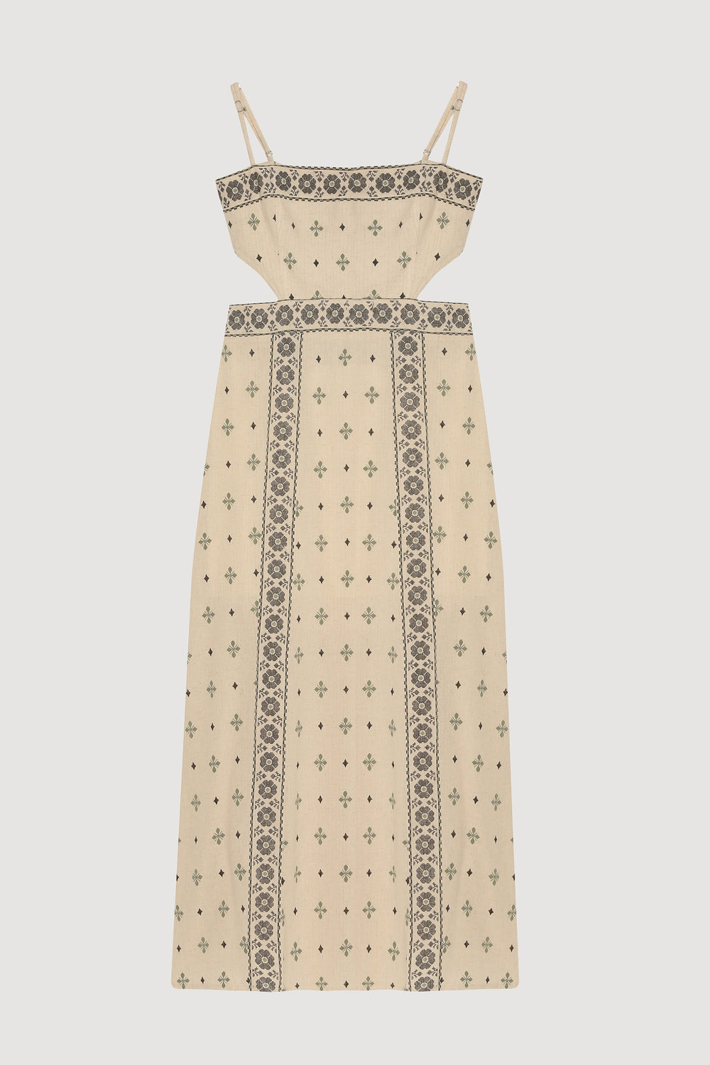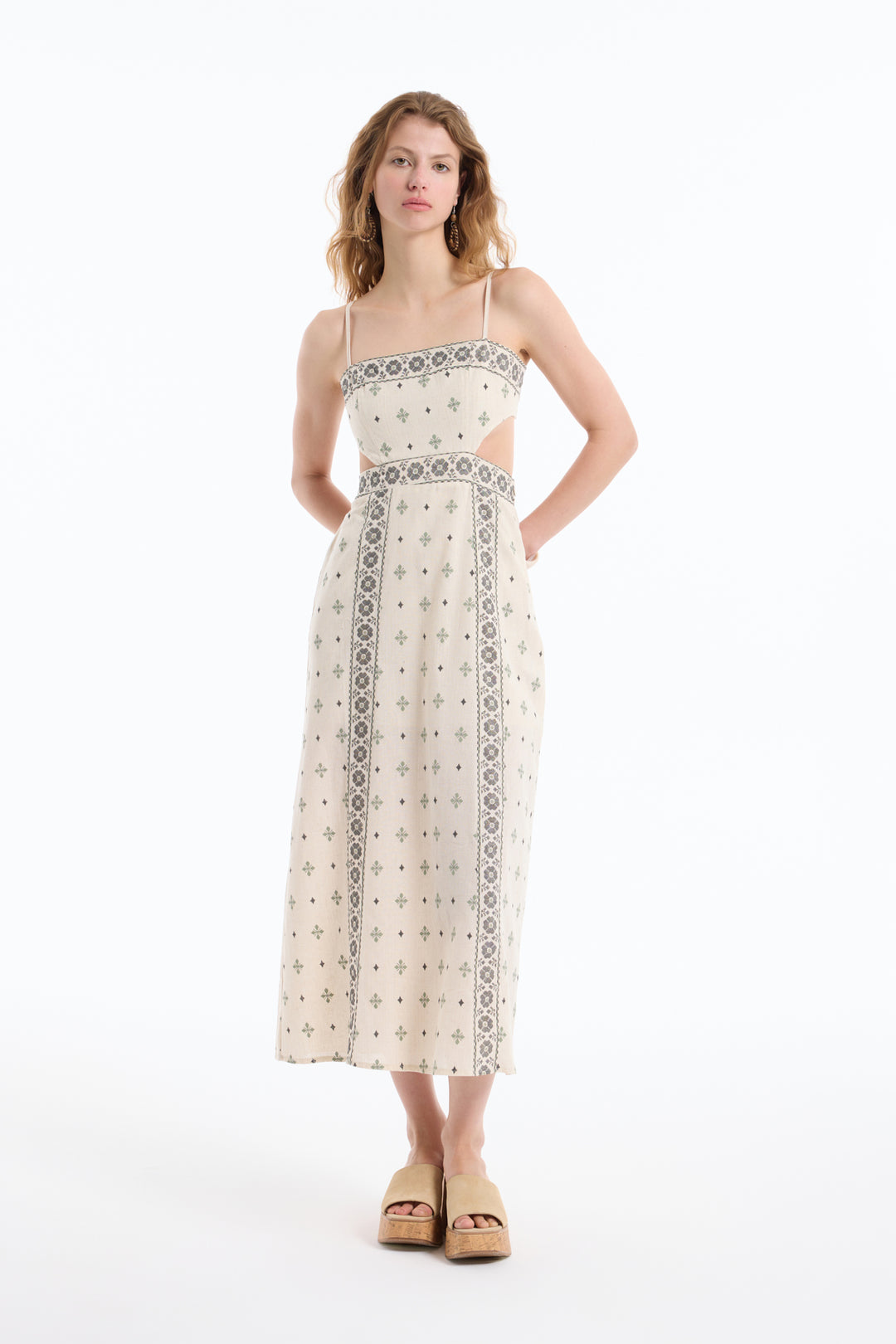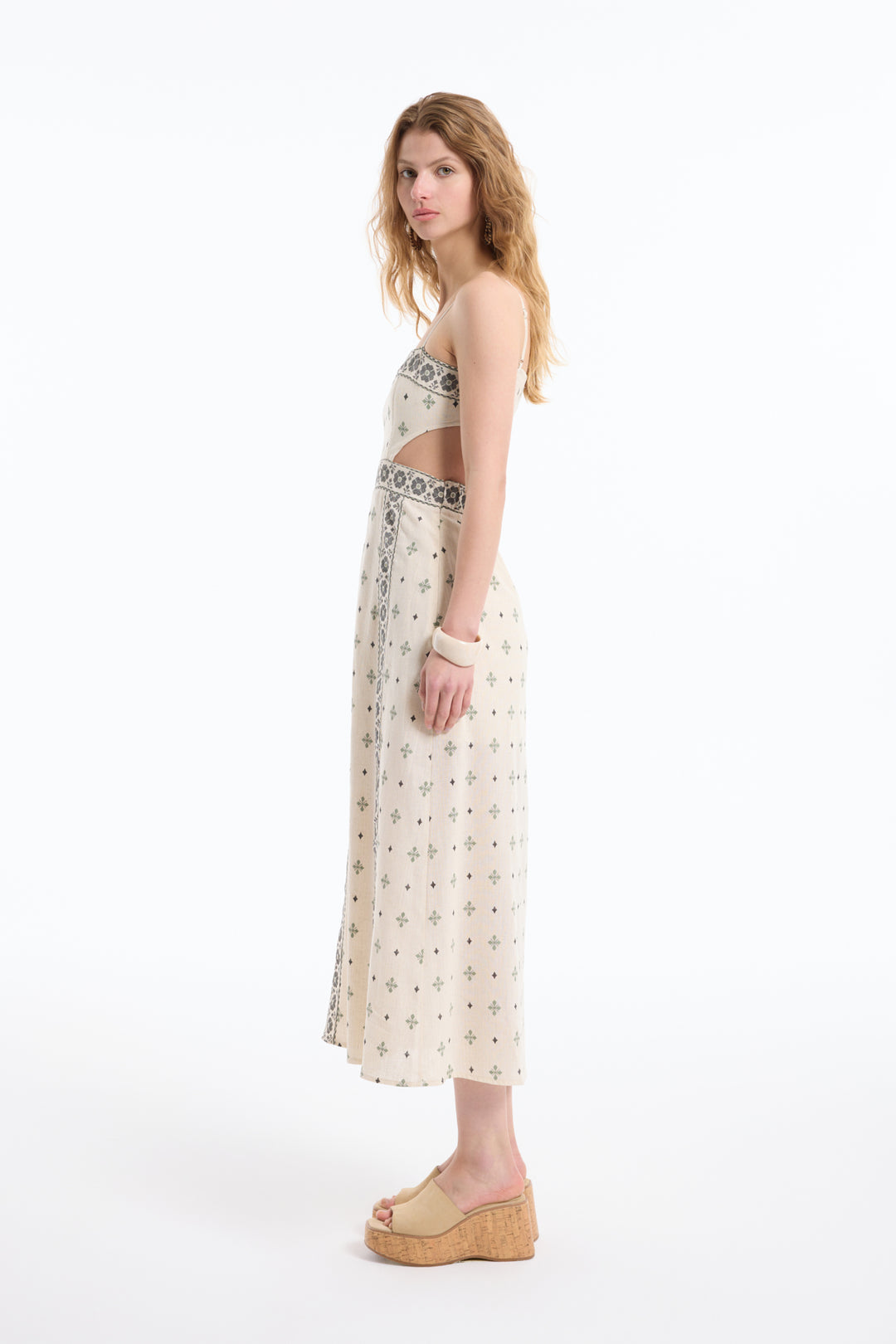 İnce askılı, etnik desenli kumaştan,cut out detaylı, sırtı lastikli dekolteli, yandan fermuar kapamalı, yarım astarlı, uzun boy elbise.