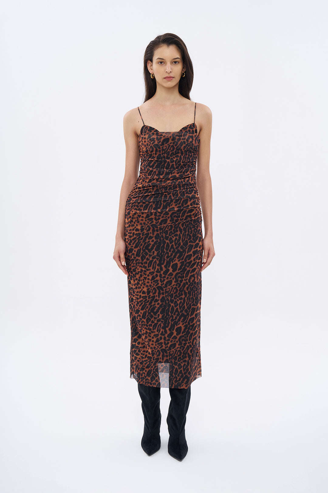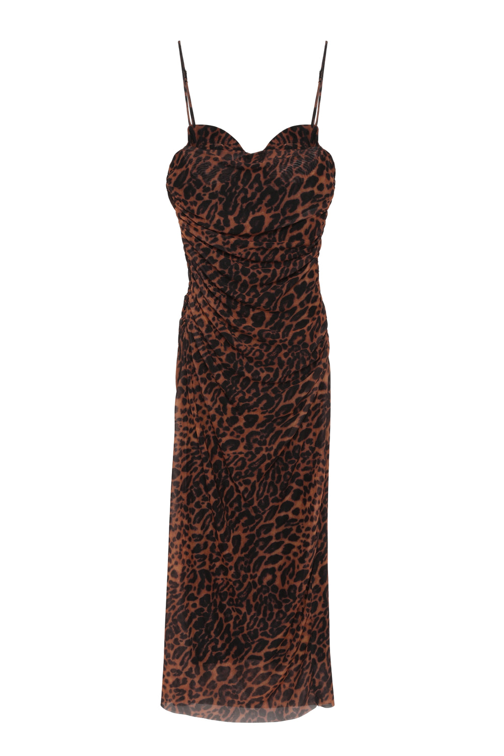 İnce askılı, kalp yaka, leopar desenli, balen detaylı, içi astarlı, sırtı fermuar kapamalı, drapeli uzun tül elbise.
