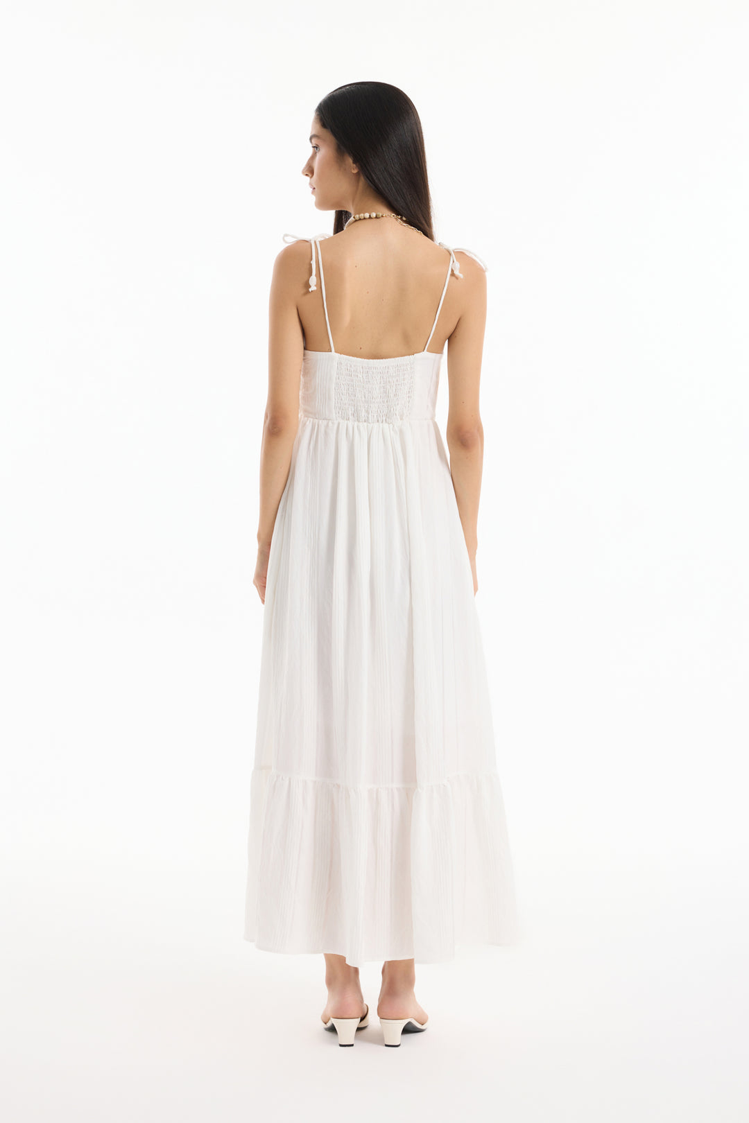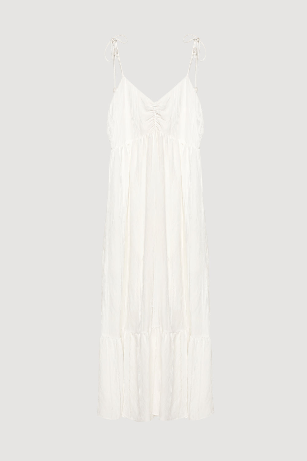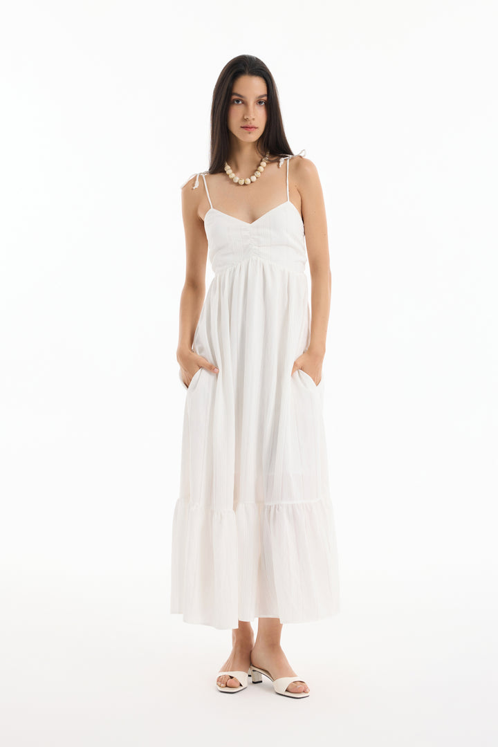 İnce Çizgili Boncuk Askılı Uzun Elbise Ekru