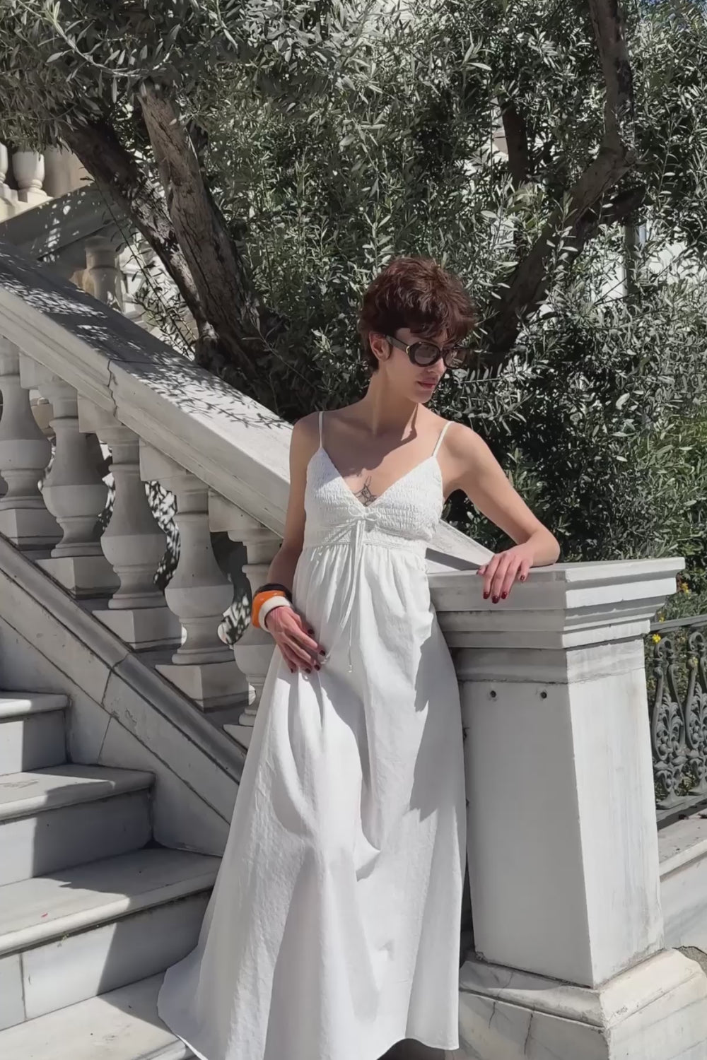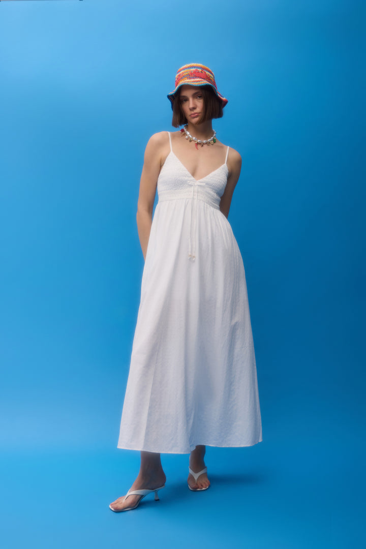 Şerit Gipe Detaylı Askılı Uzun Elbise Ekru