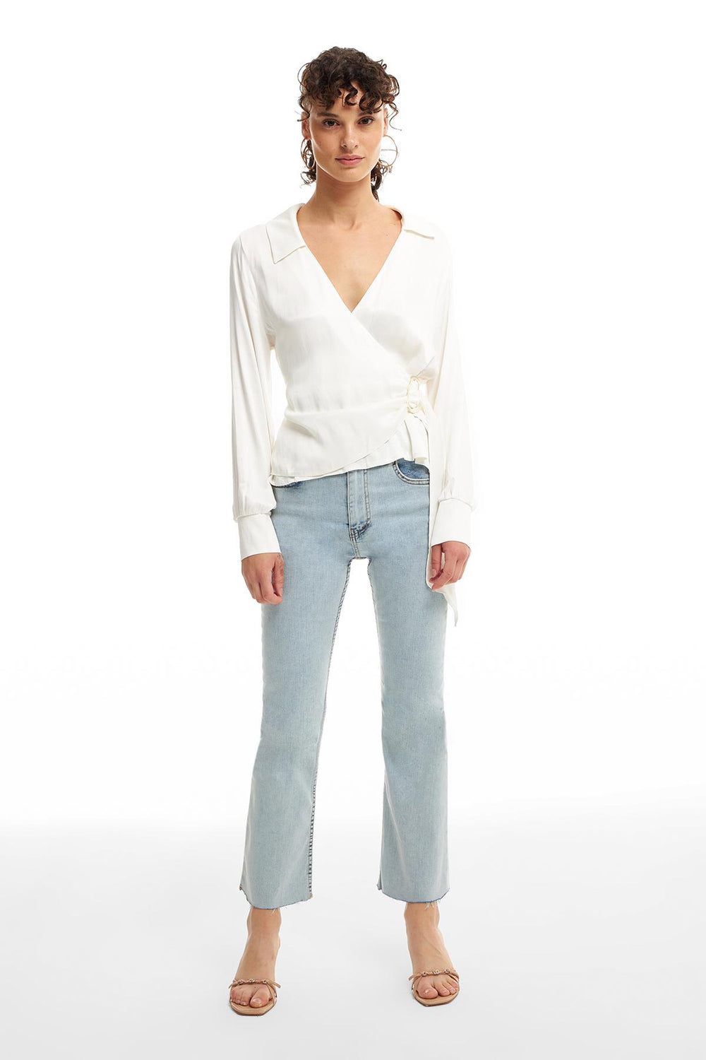Kruvaze Bağlamalı Saten Gömlek Ekru