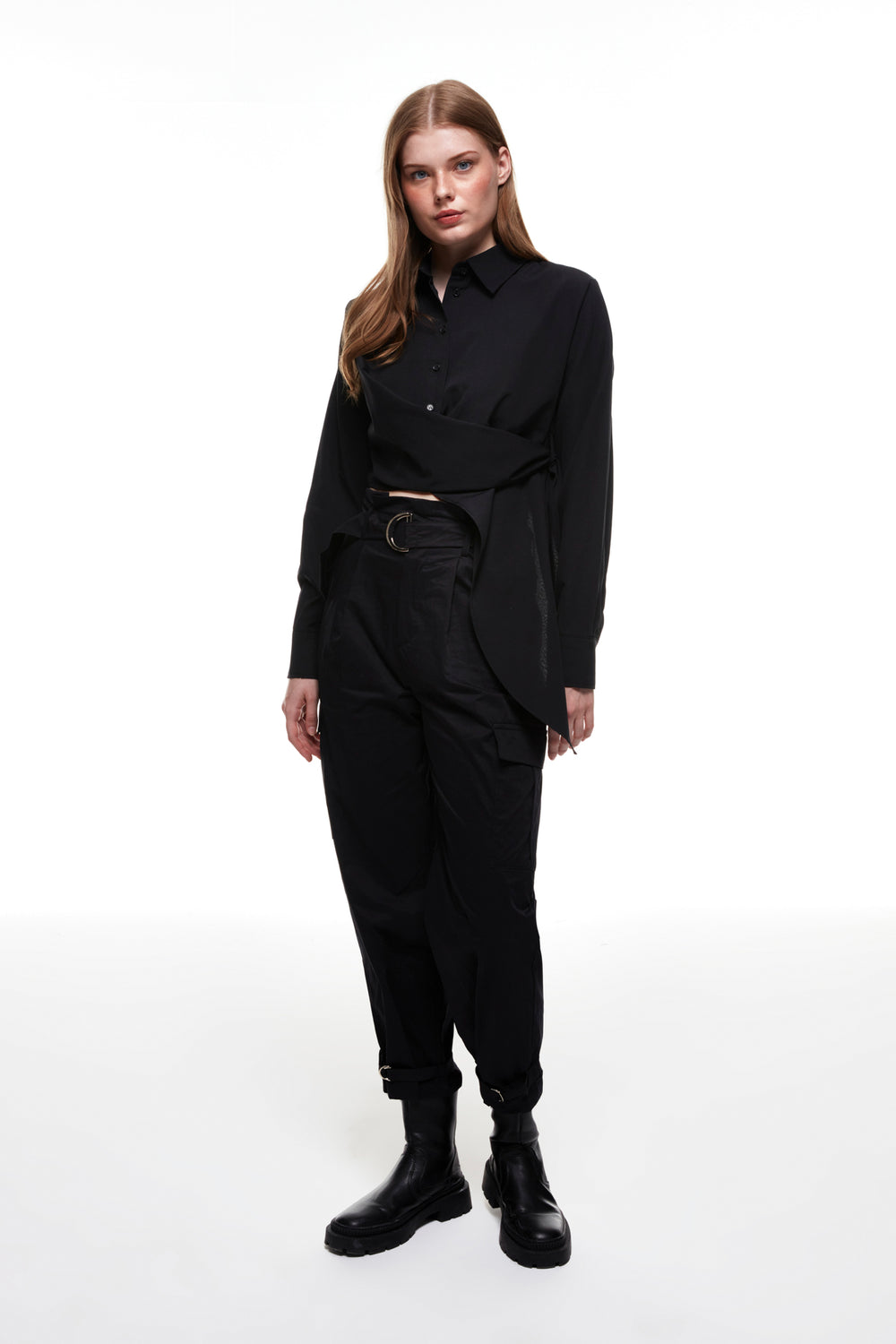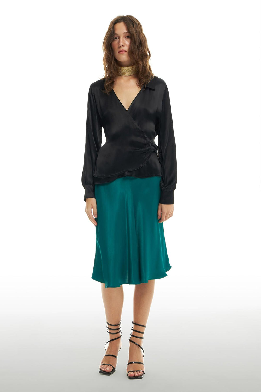 Kruvaze Bağlama Detaylı Saten Gömlek Siyah