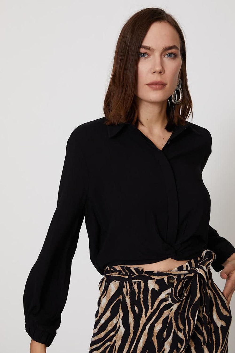 Beli Bağcıklı Manşet Kol Gömlek Siyah