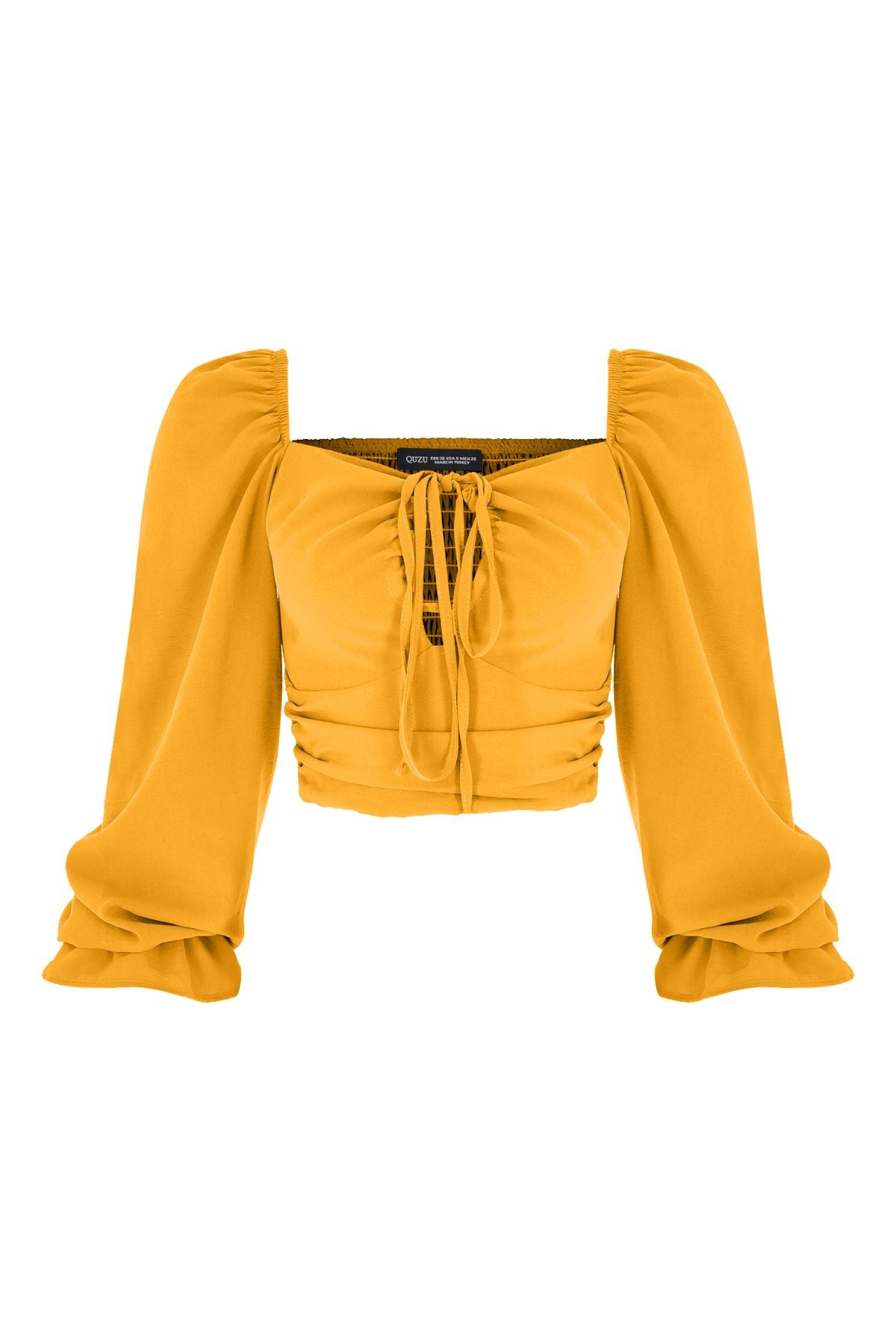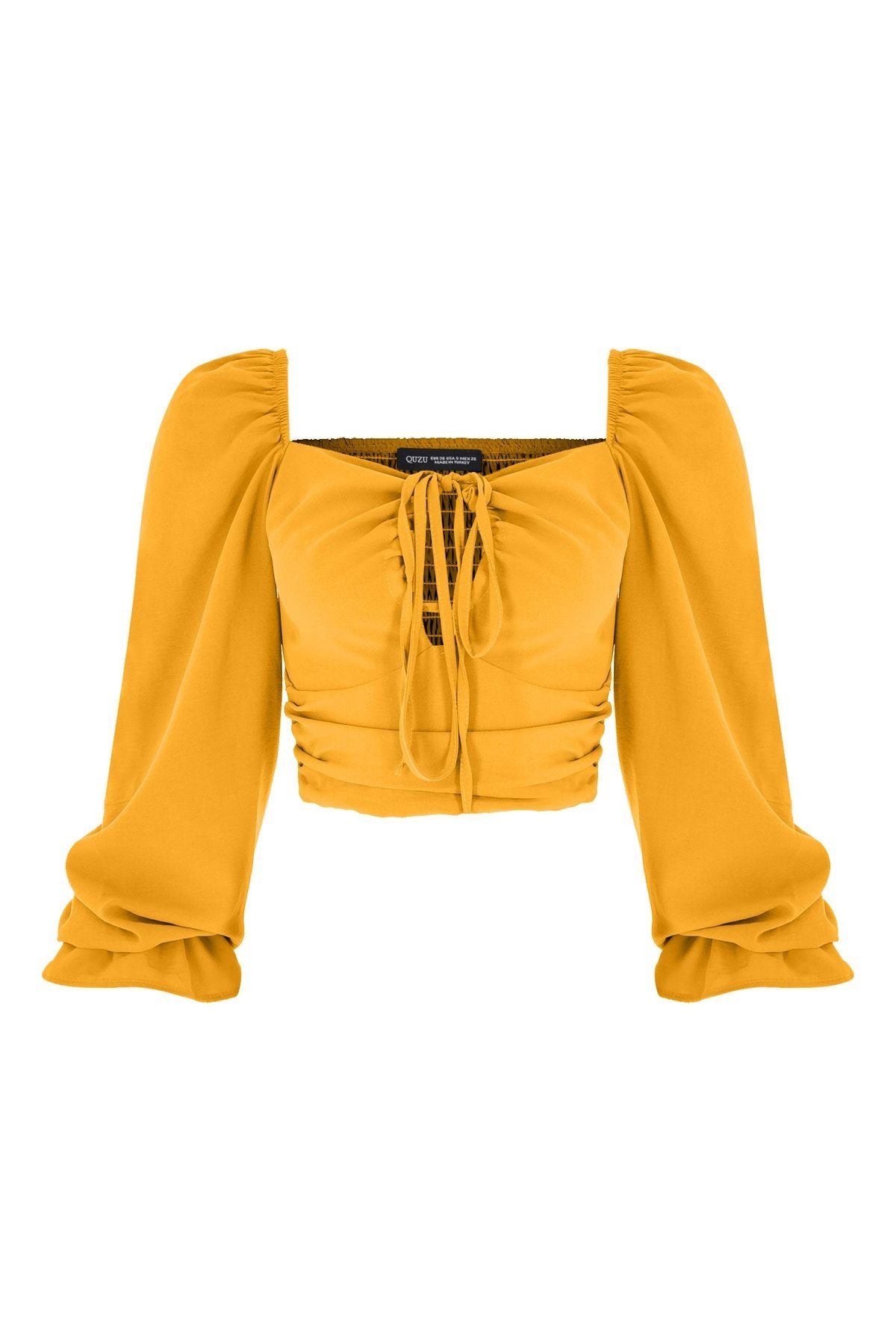 The ruffle detail on the sleeve end of the balloon sleeve blouse model, which gains an elegant look with the lace on the collar and the decollete detail that brings this lace to the fore, also adds a nice movement to the design. You can choose the decollete cropped blouse model, which gains an energetic look with the ruffled details on the shoulder and the frilly details on the sleeve, with different bottom clothing models. The back of the pool neck cropped blouse model is gipped.