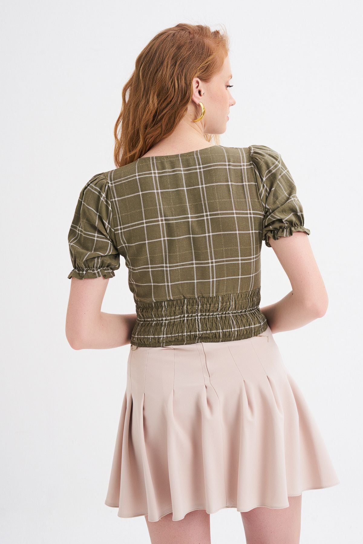 V Neck Plaid Linen Blouse Khaki