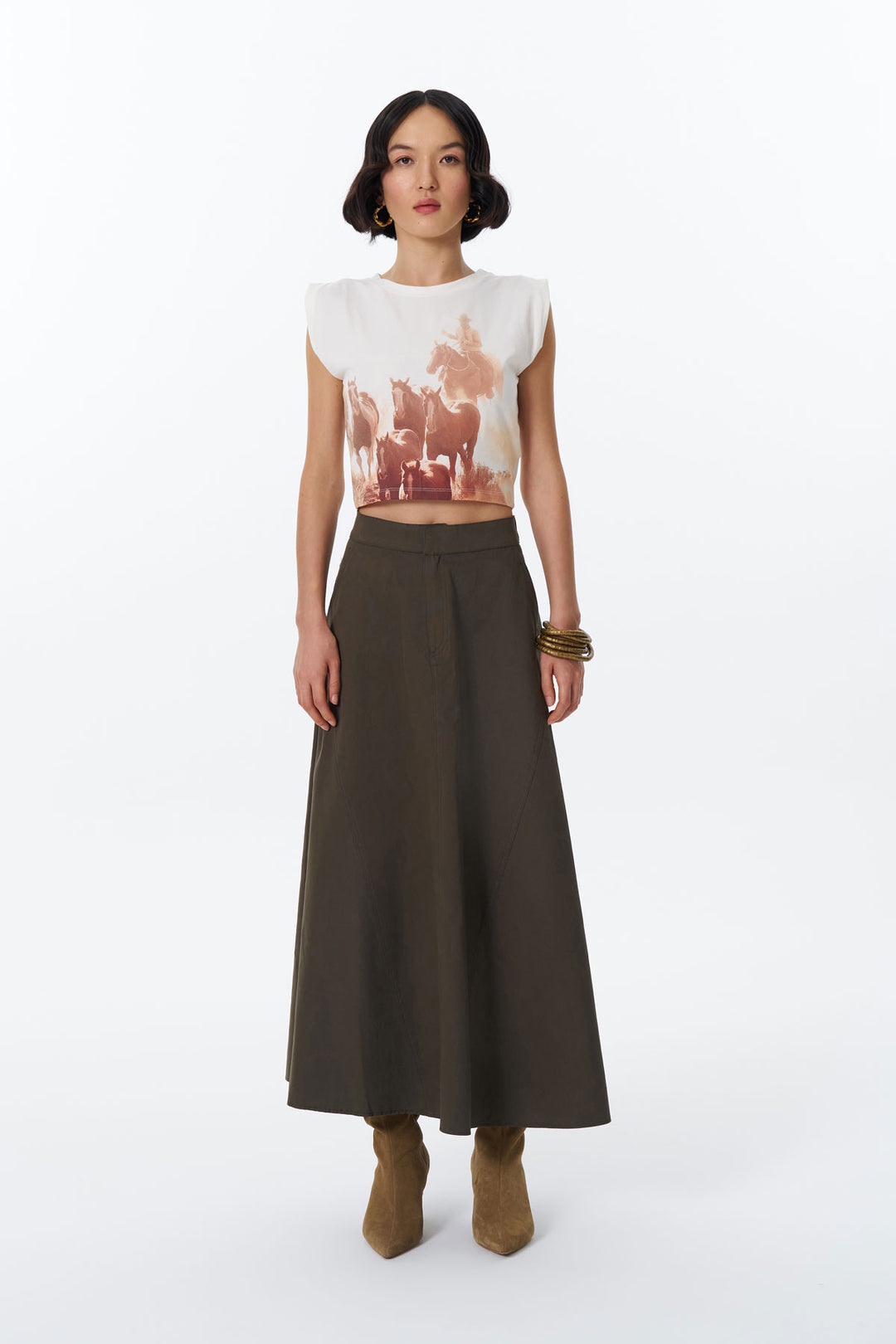 Beli Lastikli Pileli Basic Midi Etek Haki