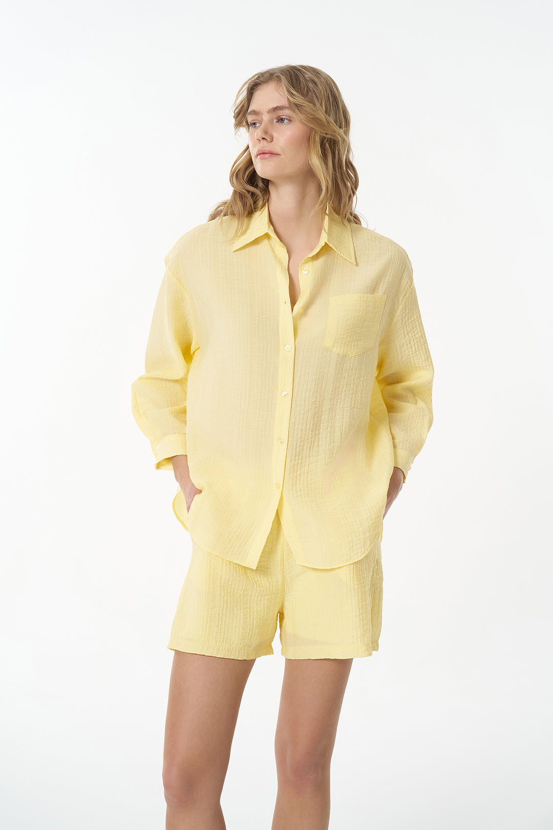 Uzun kollu, dokulu kumaştan üretilmiş, cep detaylı, düğme kapamalı modern ve şık görünüm sunan oversize gömlek.