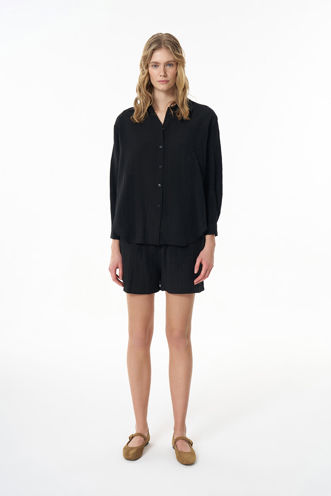 Dokulu Cepli Oversize Basic Gömlek Siyah
