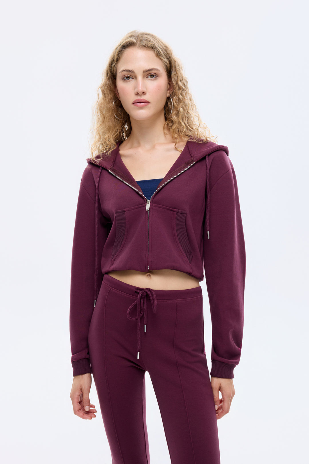 Kapüşonlu, önden kıvrım detaylı arkası düz, fermuar kapamalı, şardonsuz, ip büzgü detaylı, kanguru cepli, uzun kollu, kısa boy, basic sweatshirt.