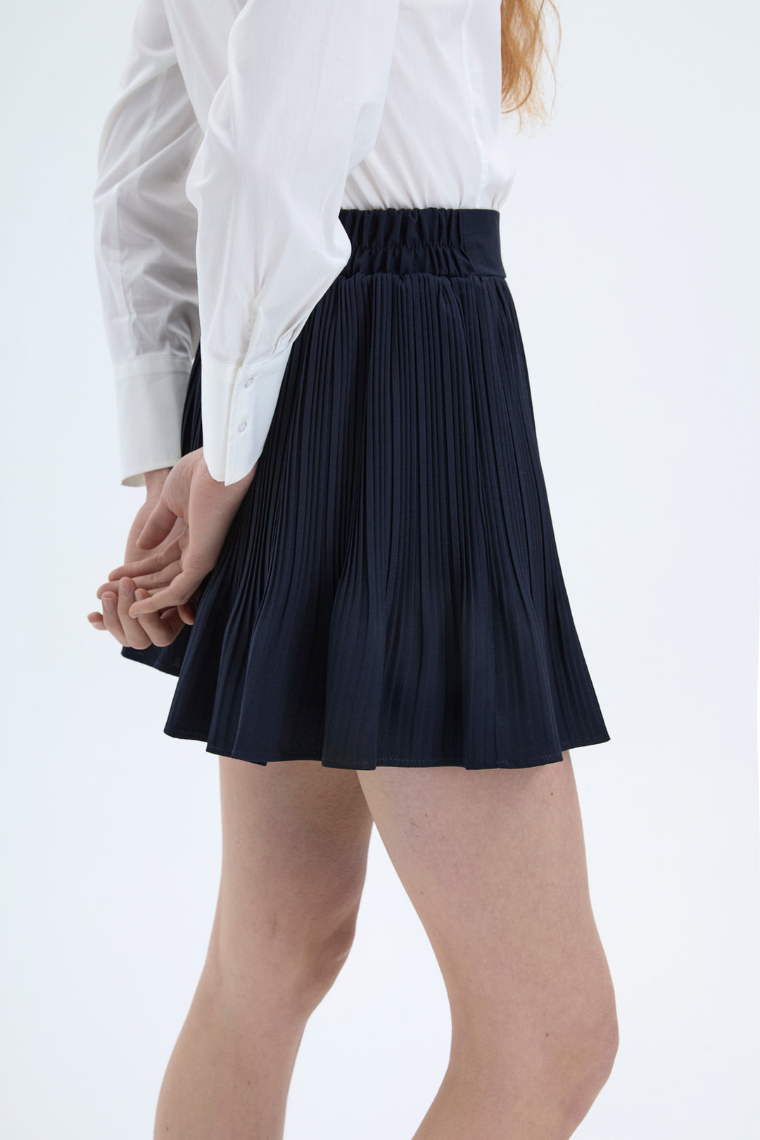Pile detaylı, yüksek belli, beli lastikli, mini etek.