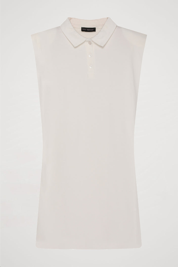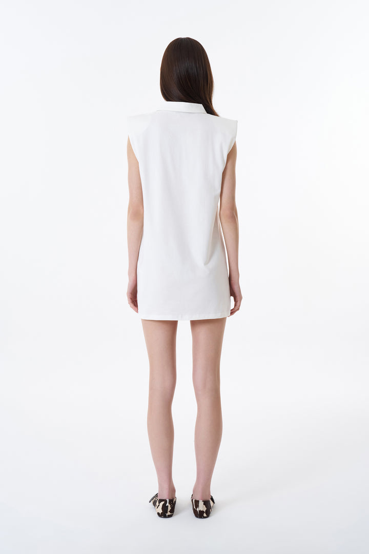 Yakası düğme detaylı, kolsuz, polo yaka, omzu vatka detaylı, düz kesim ve sade tasarımlı, zarif mini boy elbise.