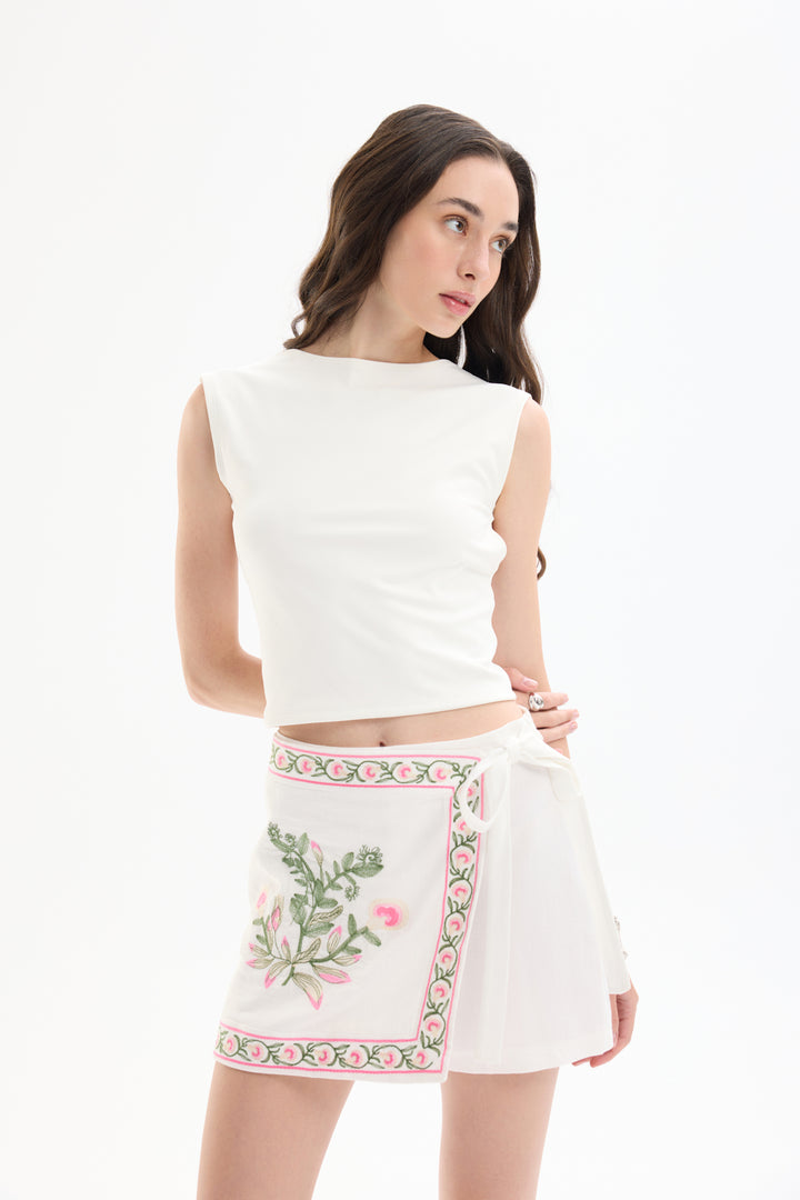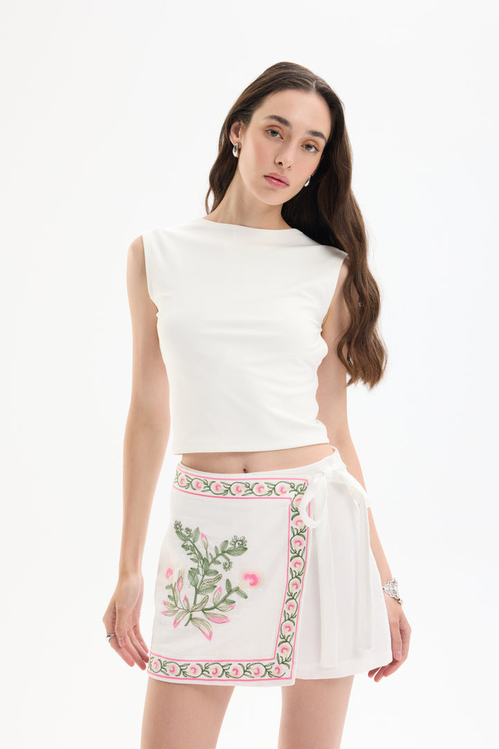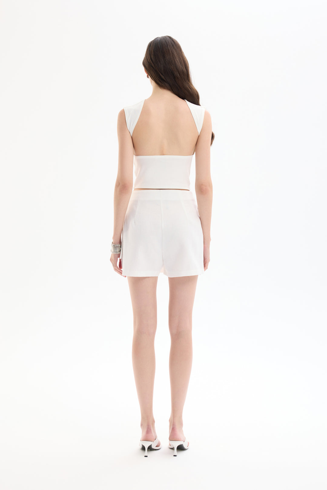 Astarsız, vücuda oturan formda, kolsuz, bisiklet yaka, sırtı dekolte detaylı, modern görünüm sunan basic crop bluz.