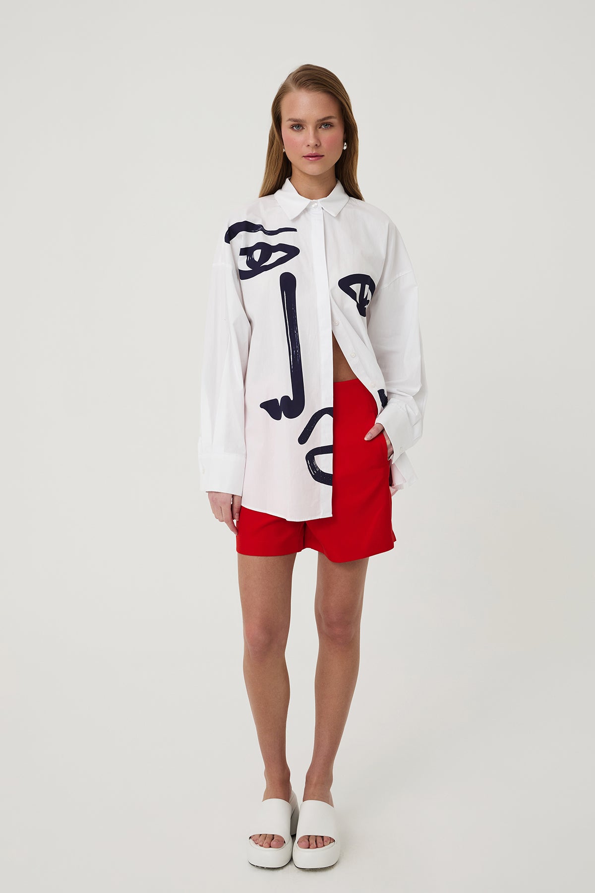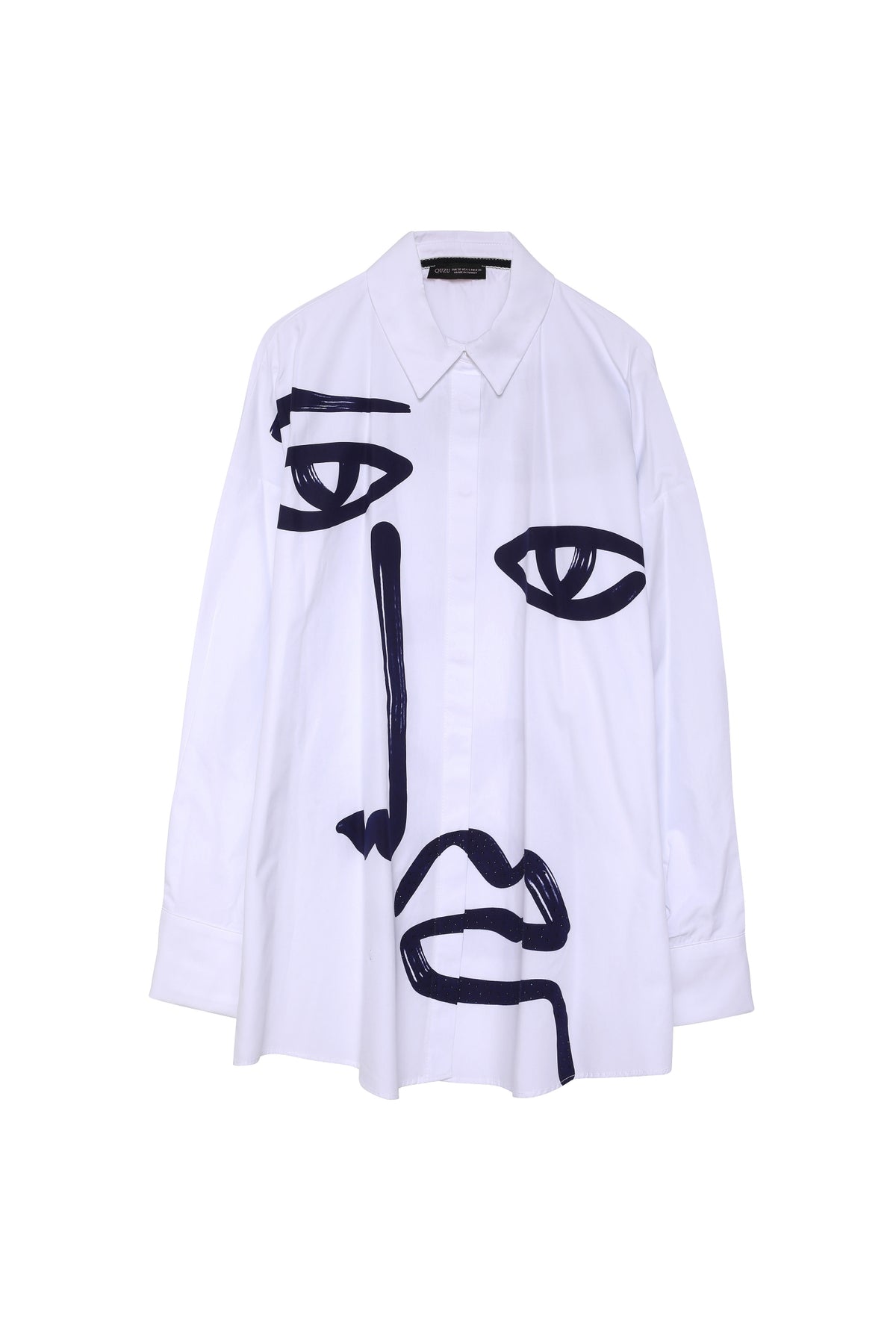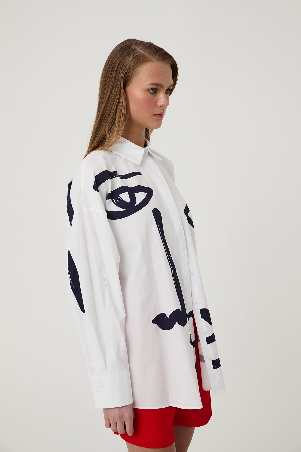 Gizli düğmeli, geniş kalıp, uzun kollu, baskı detaylı, gömlek.