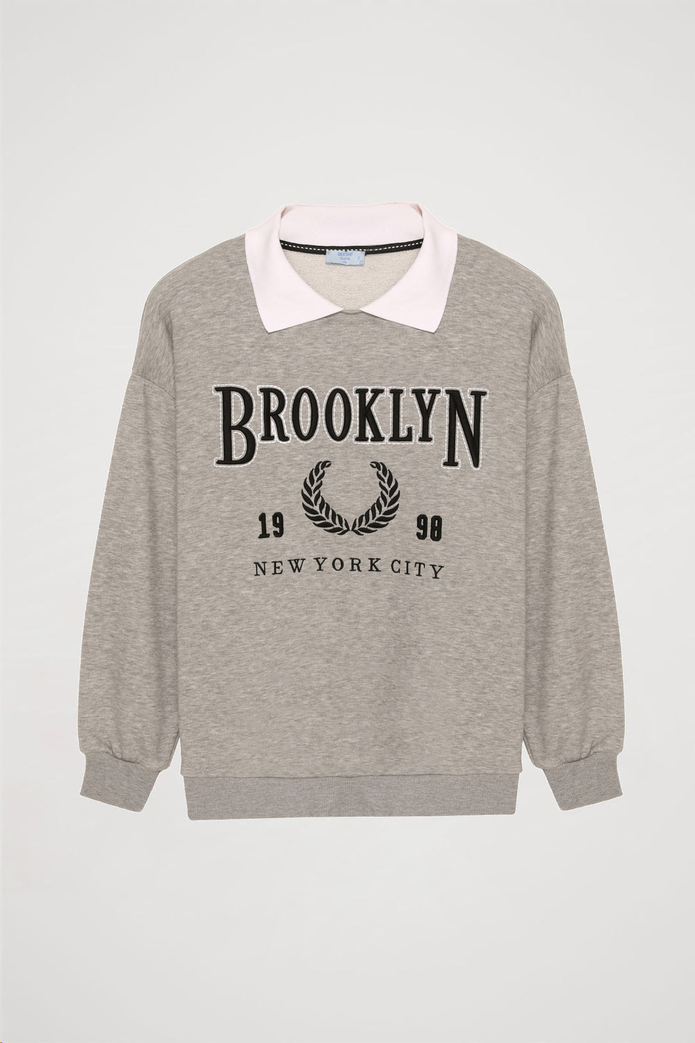 Kontrast bebe yaka detaylı, uzun kollu, ön yüzünde "brooklyn" yazı nakış baskısı bulunan, oversize sweatshirt.