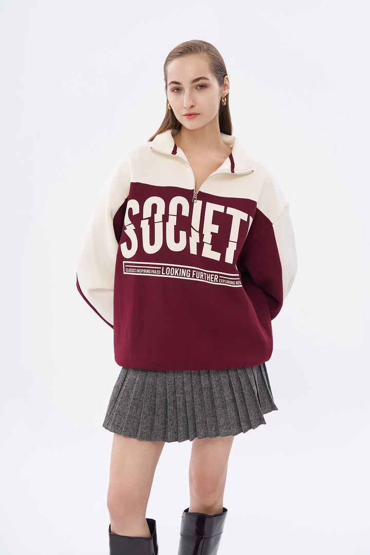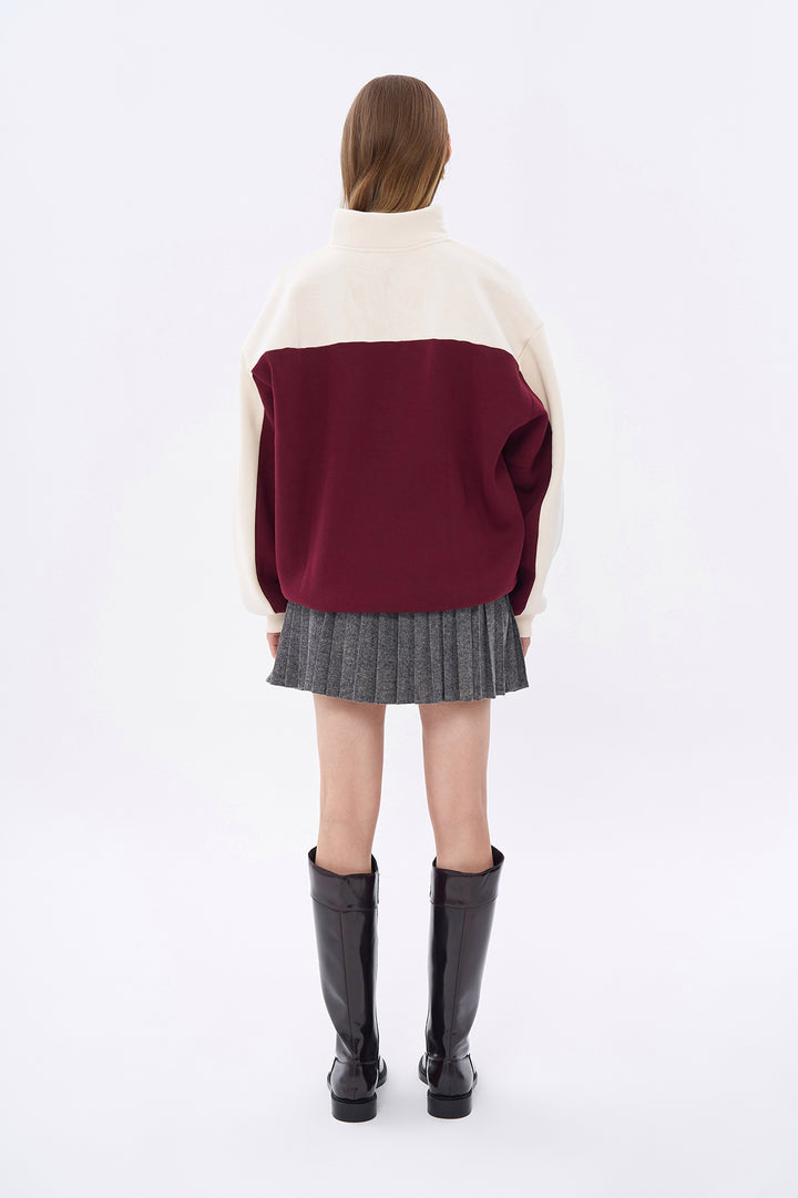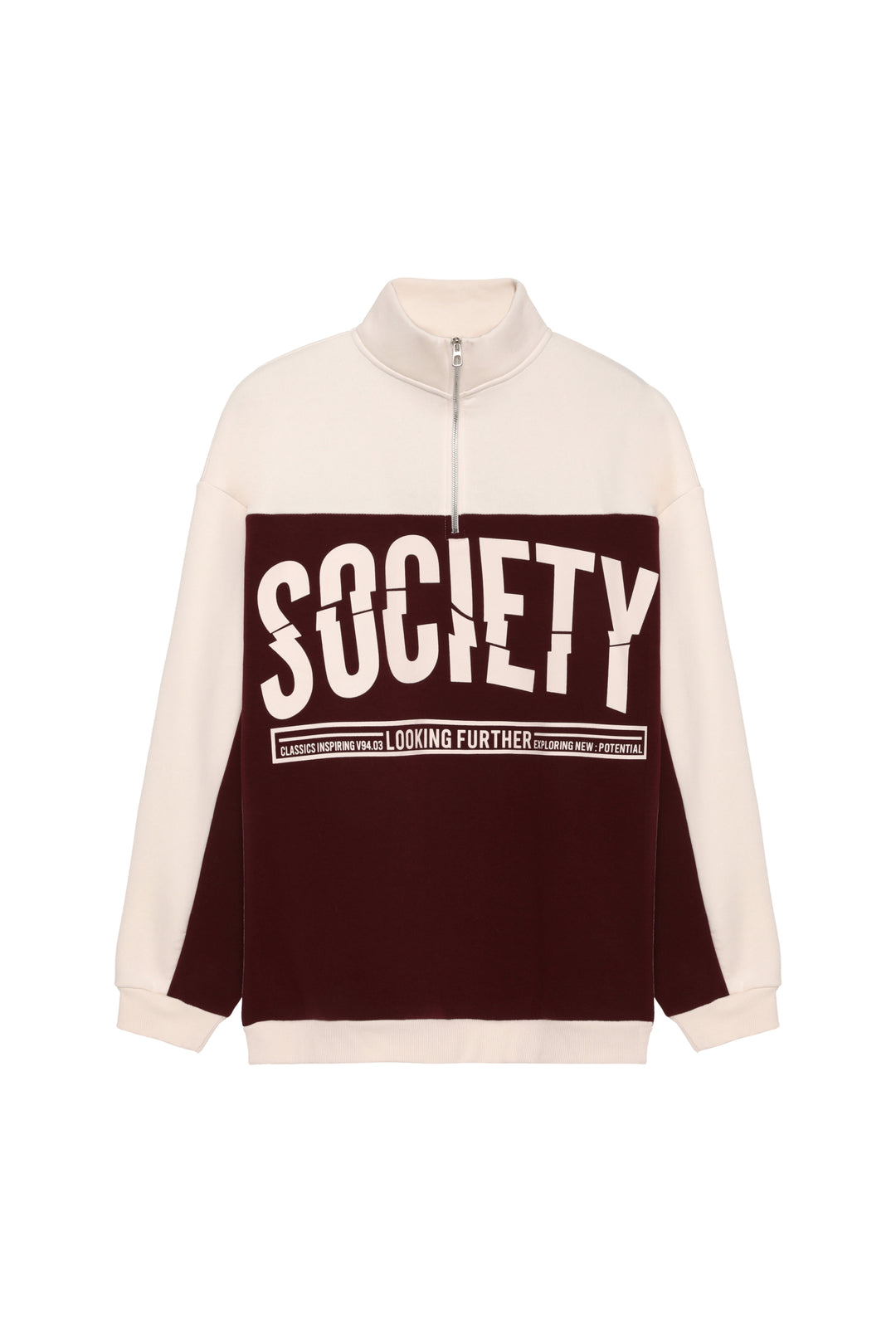 Renk blok detaylı, yazı baskılı, dik yaka fermuarlı, uzun kol, oversize sweatshirt.