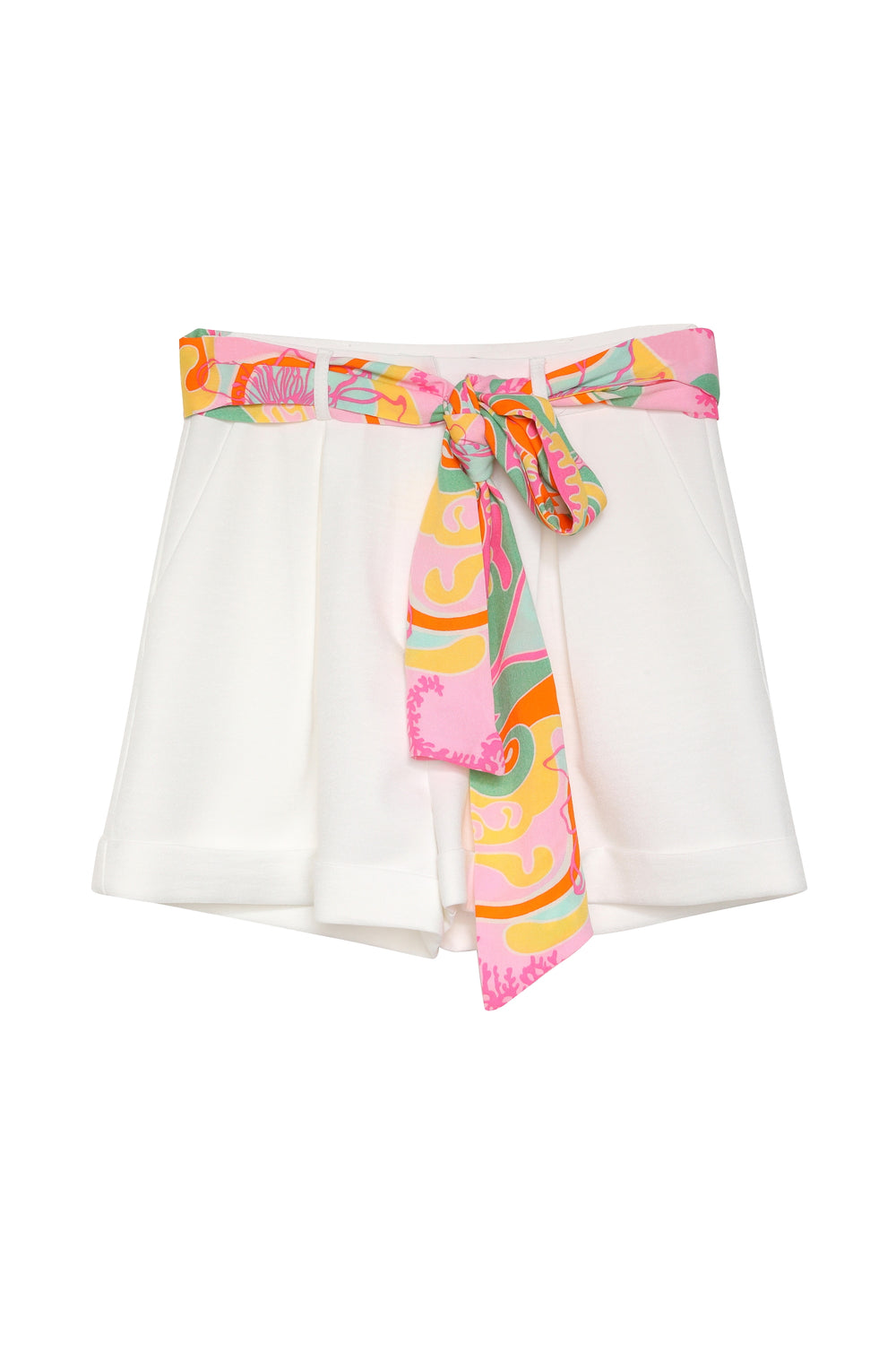 Yüksek bel, belinde desenli kuşak detaylı, duble paça, mini şort.