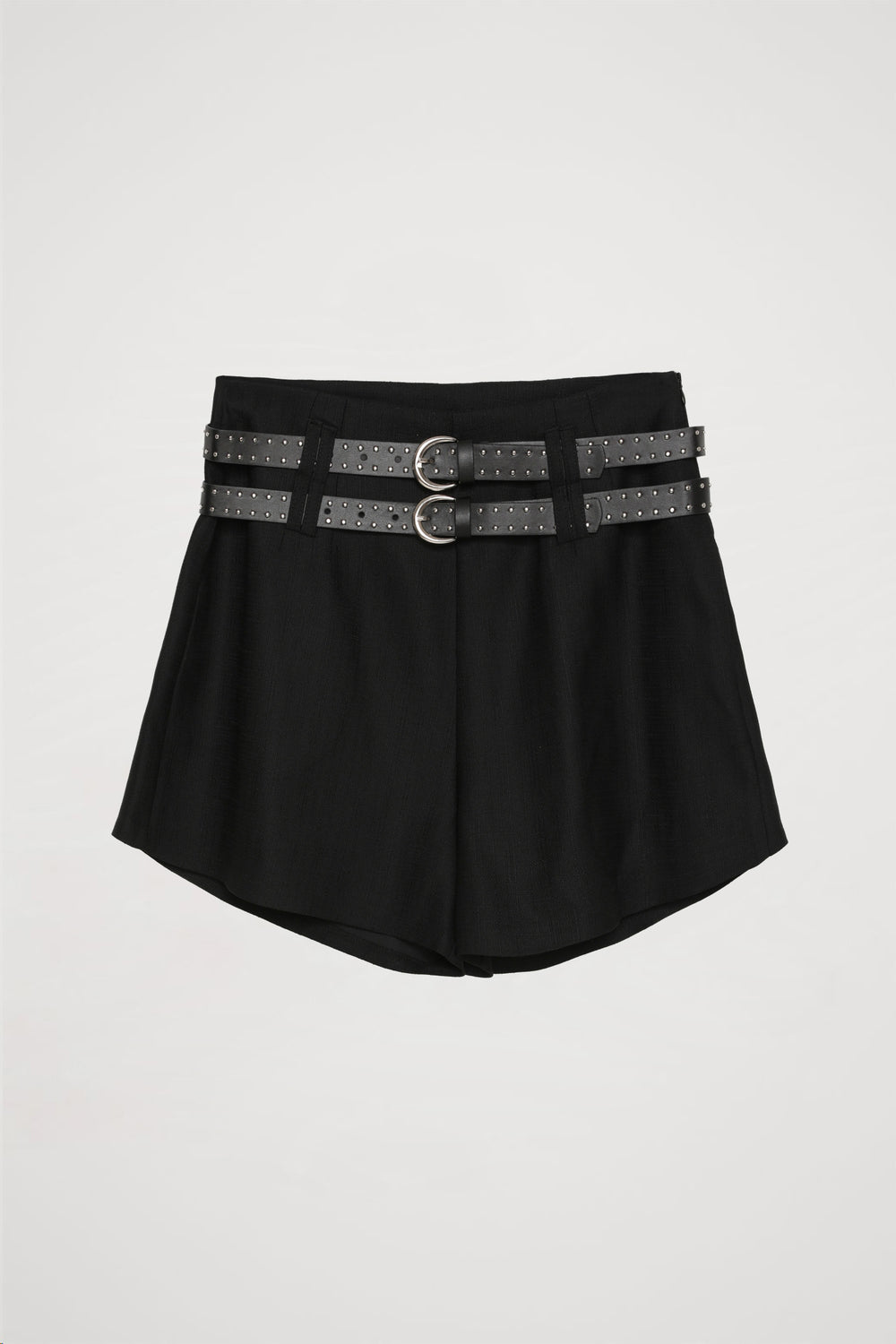Çift kemer detaylı, beli ayarlanabilir metal tokalı, çift cepli, yandan fermuar kapamalı, günlük ve şık kombinlere modern bir dokunuş katan mini şort.