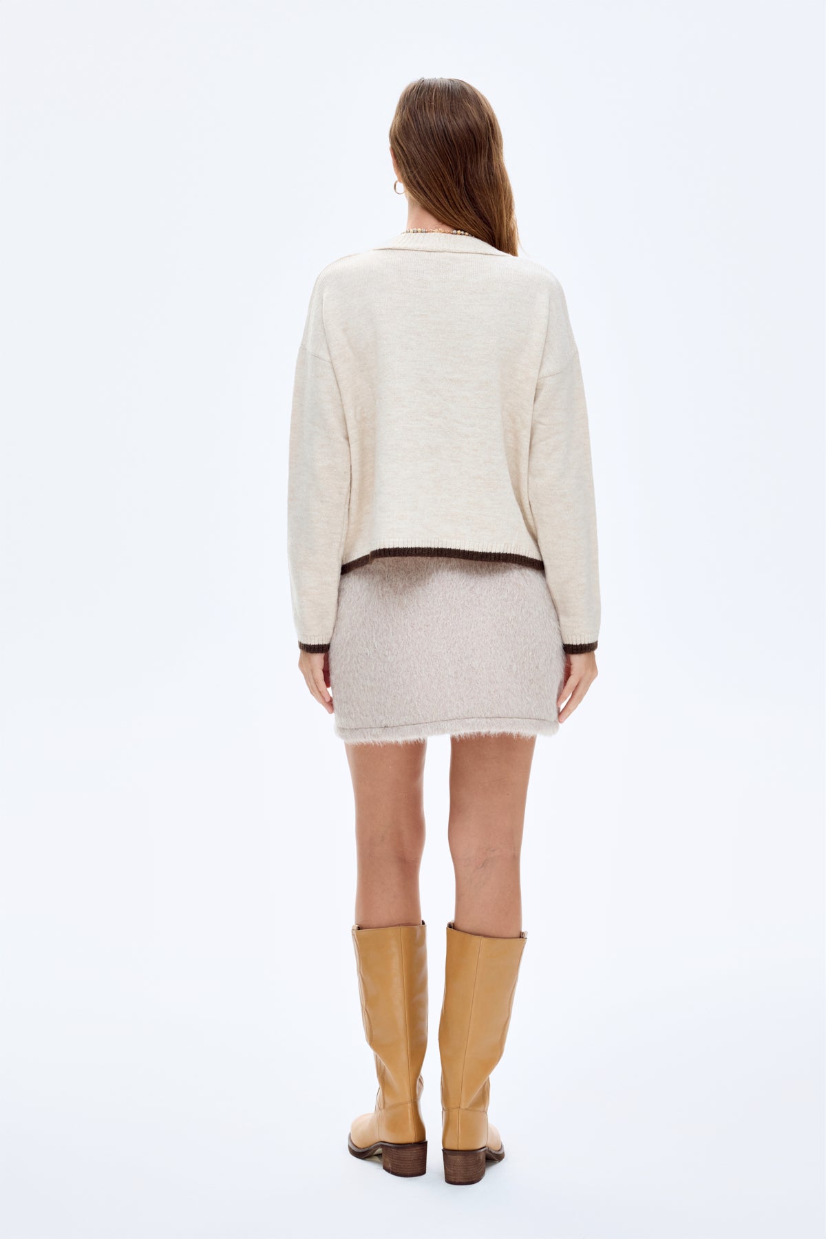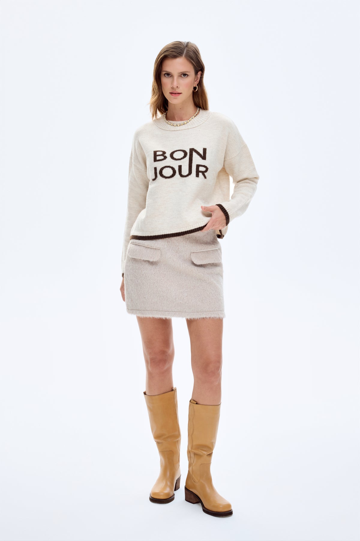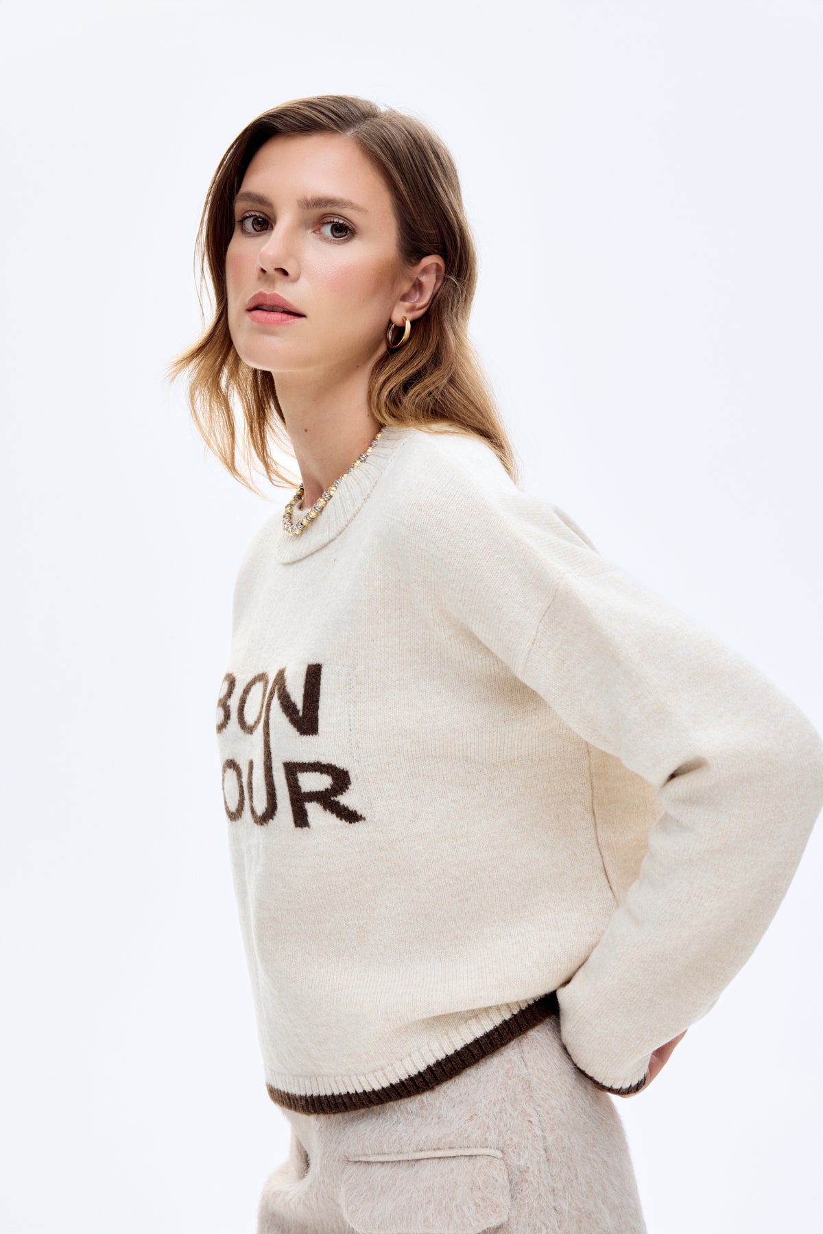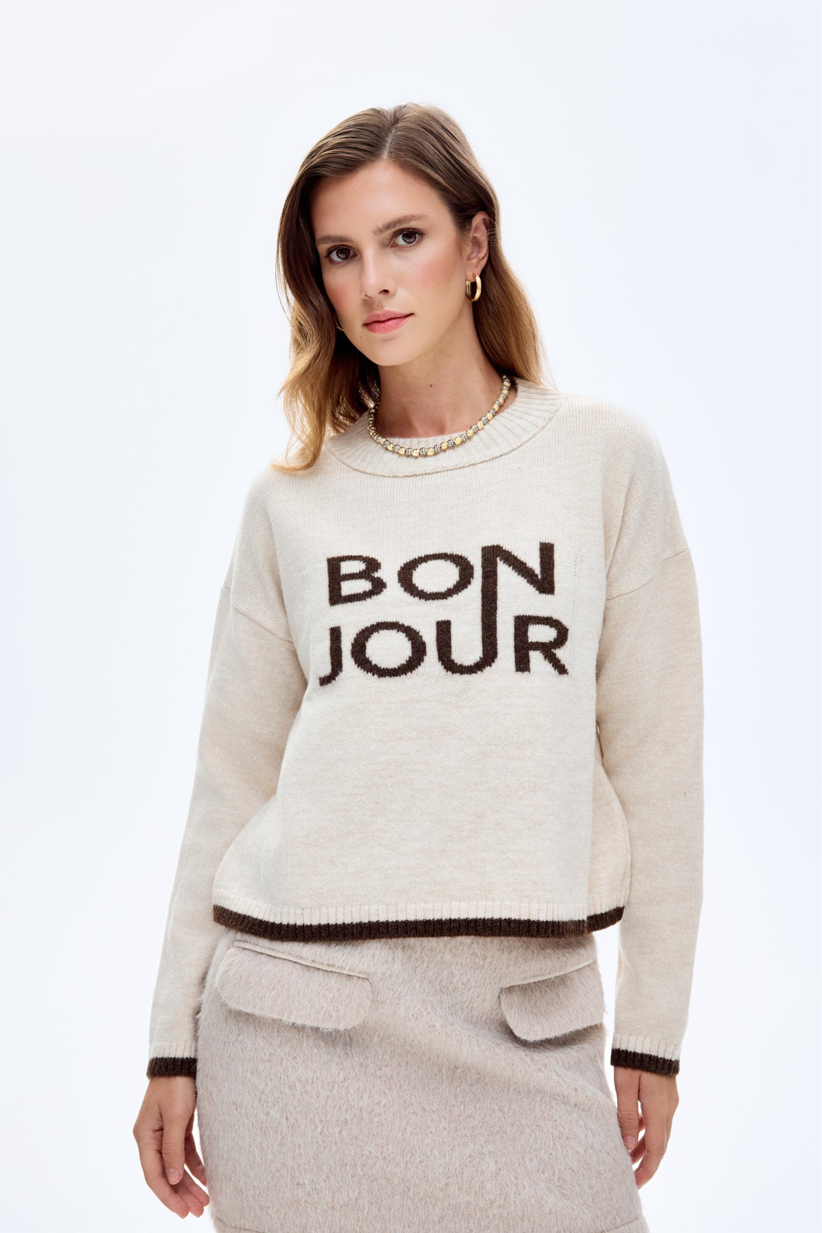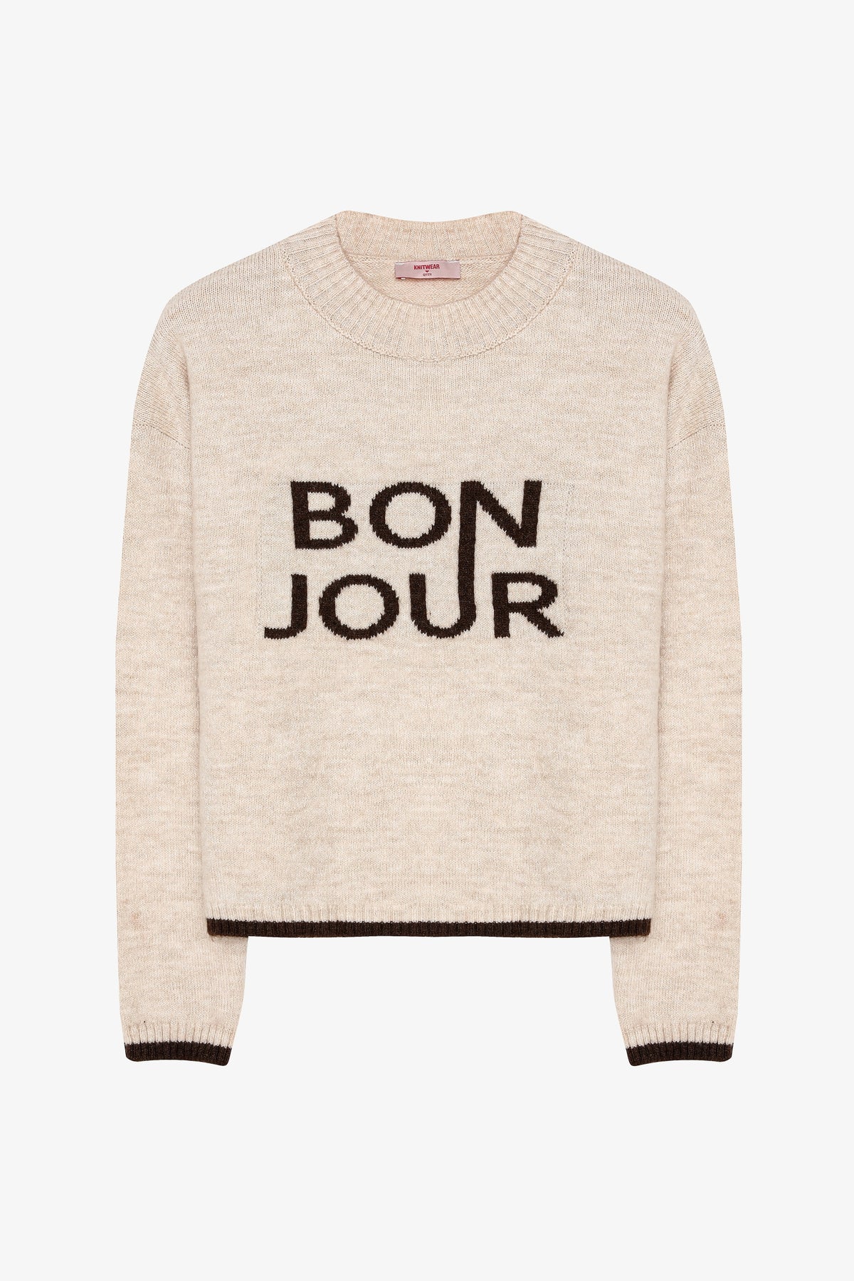 Bonjour Yazılı Bisiklet Yaka Triko Kazak Krem