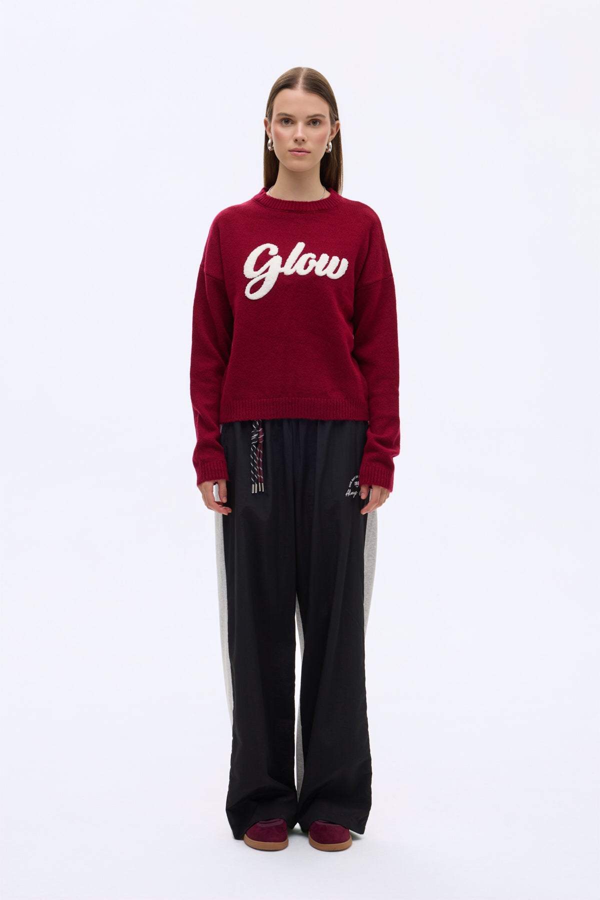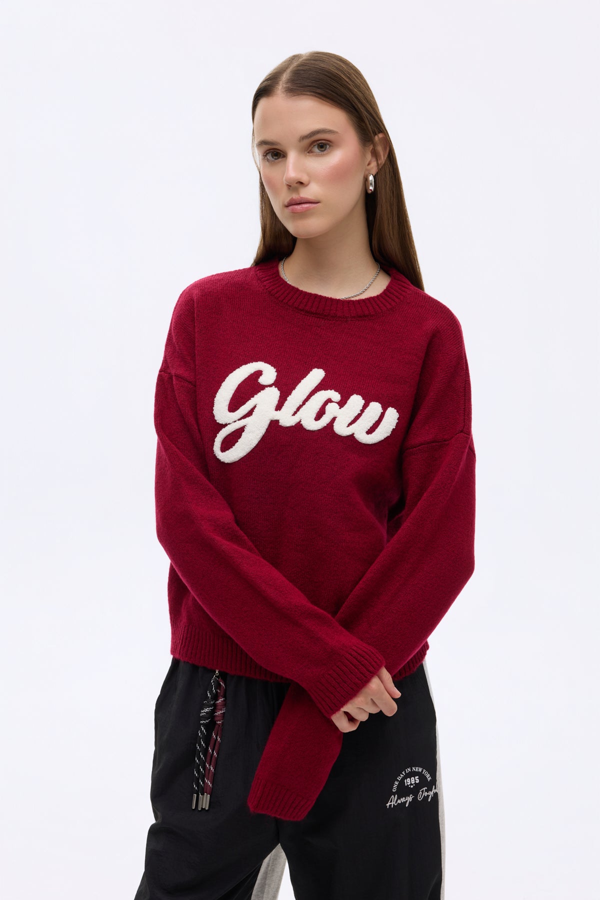 Yuvarlak yaka, ön kısmı “Glow” kabartma yazı detaylı, uzun kollu, düz kesim, yumuşak dokulu kumaş, triko kazak.