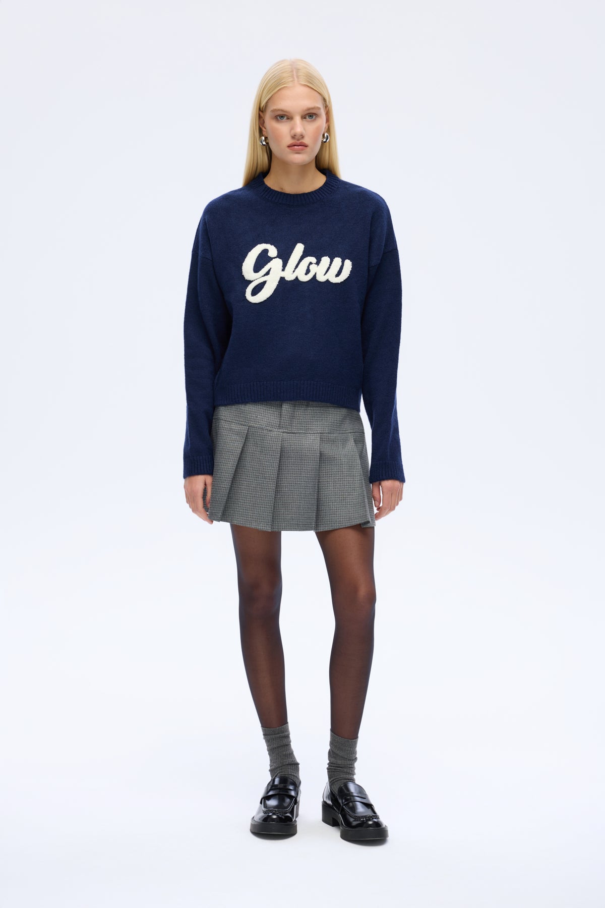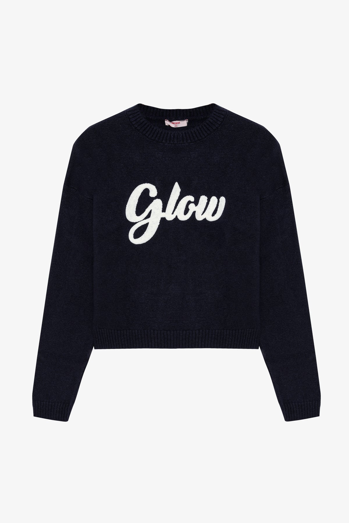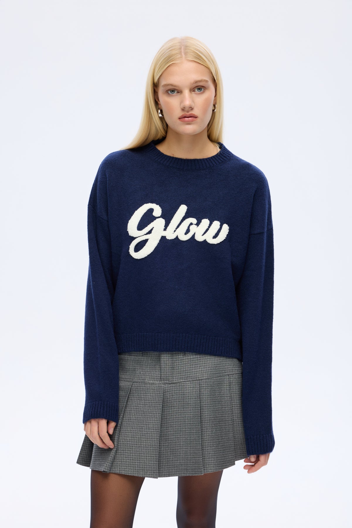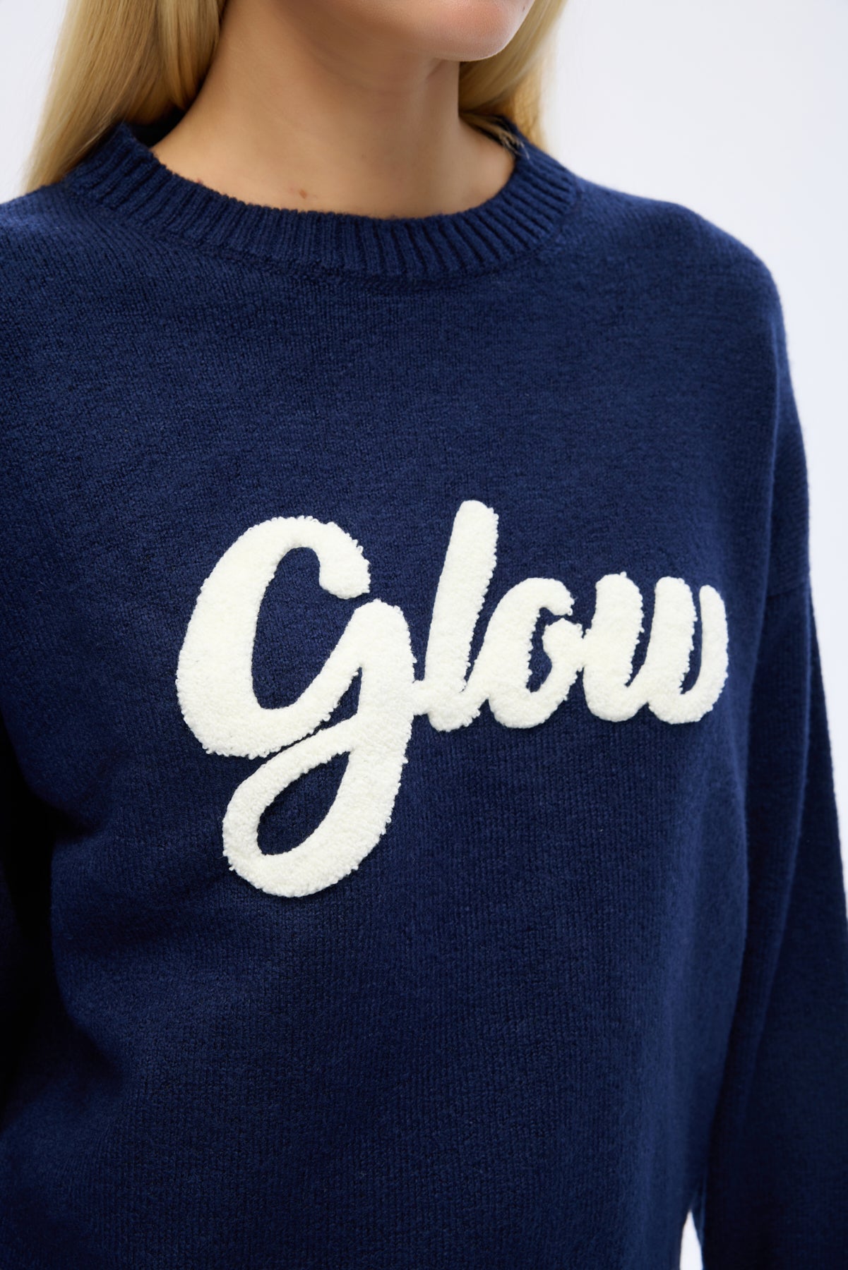 Yuvarlak yaka, ön kısmı “Glow” kabartma yazı detaylı, uzun kollu, düz kesim, yumuşak dokulu kumaş, triko kazak.
