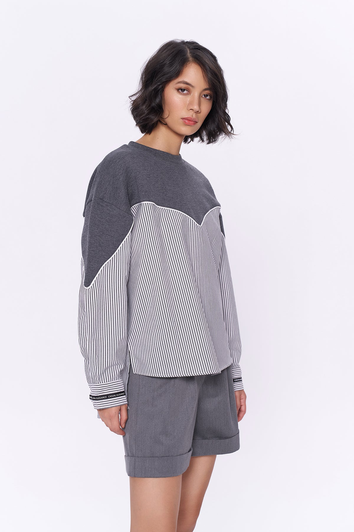 Çizgili kumaş match detaylı, uzun kol, bisiklet yaka, oversize sweatshirt.