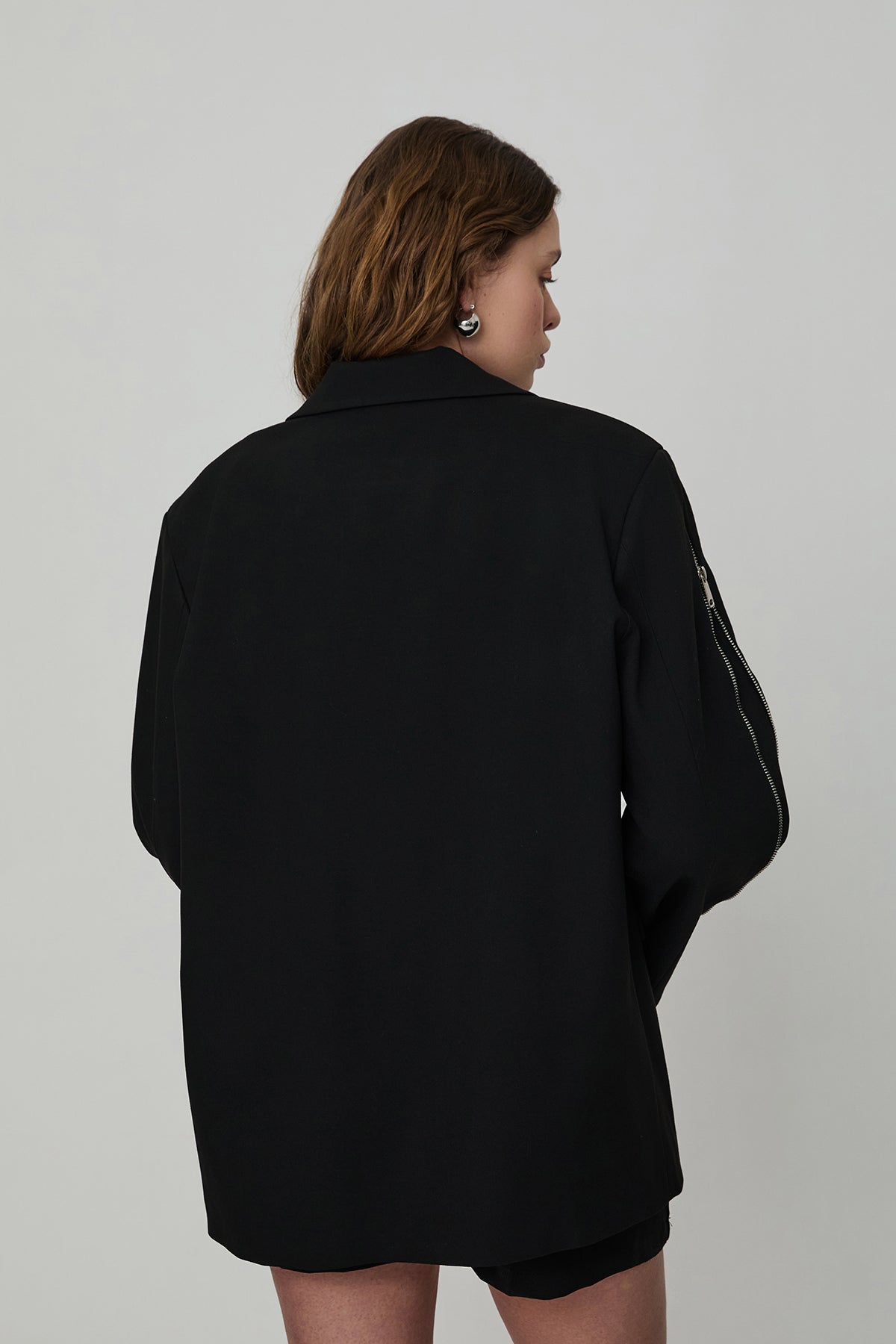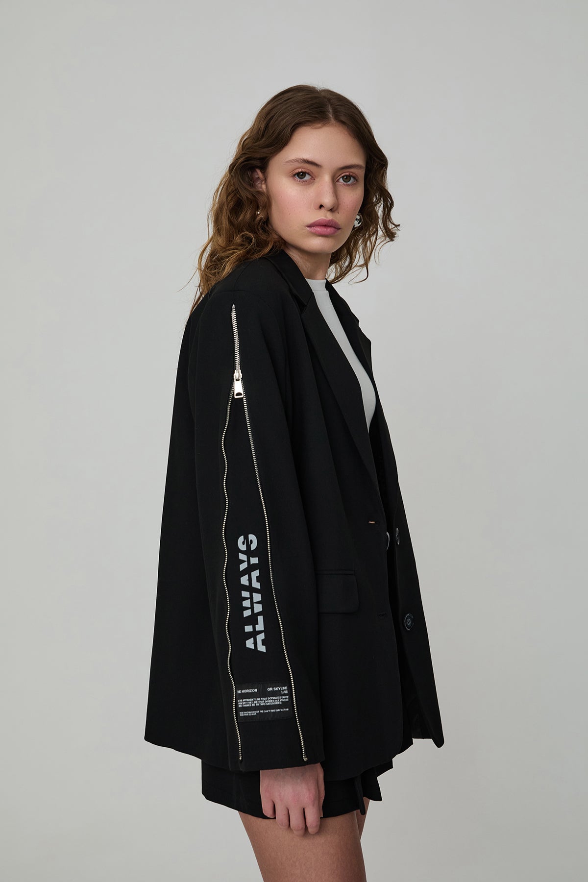 Astarı Desenli Kolu Fermuar Detaylı Blazer Ceket Siyah
