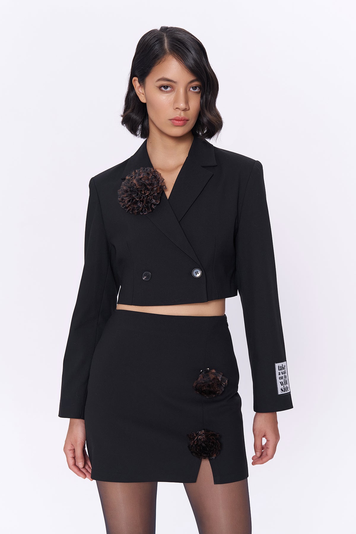 Gül Aksesuarlı Crop Blazer Ceket Siyah