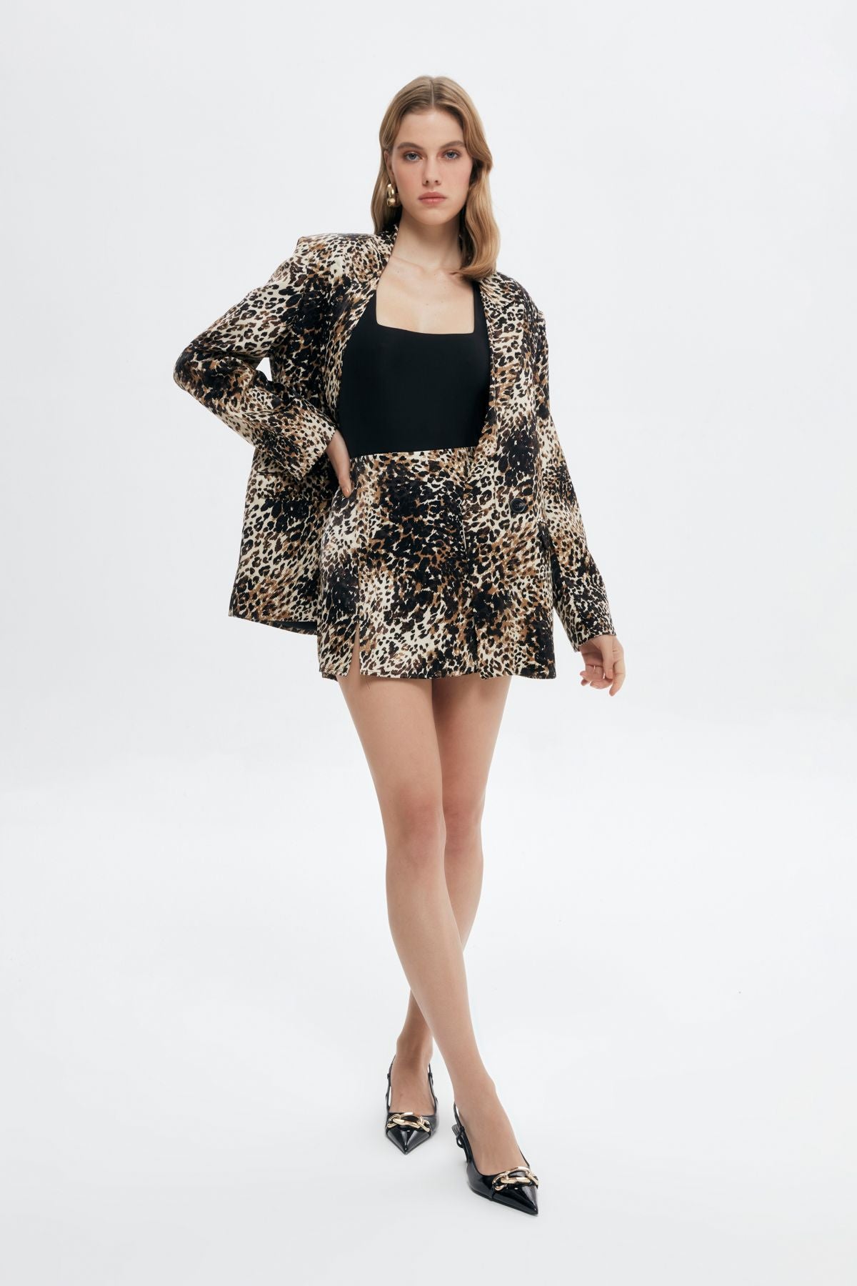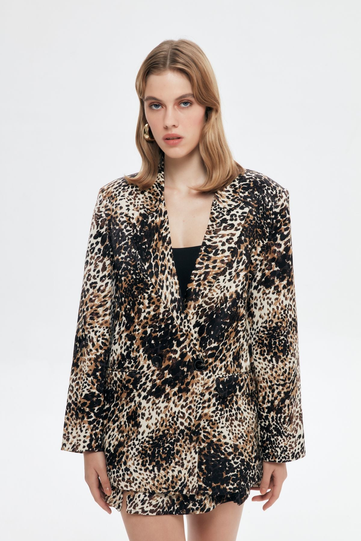 Leopard blazer jacket with inner lining, double-breasted collar, double pocket details, padded shoulders.