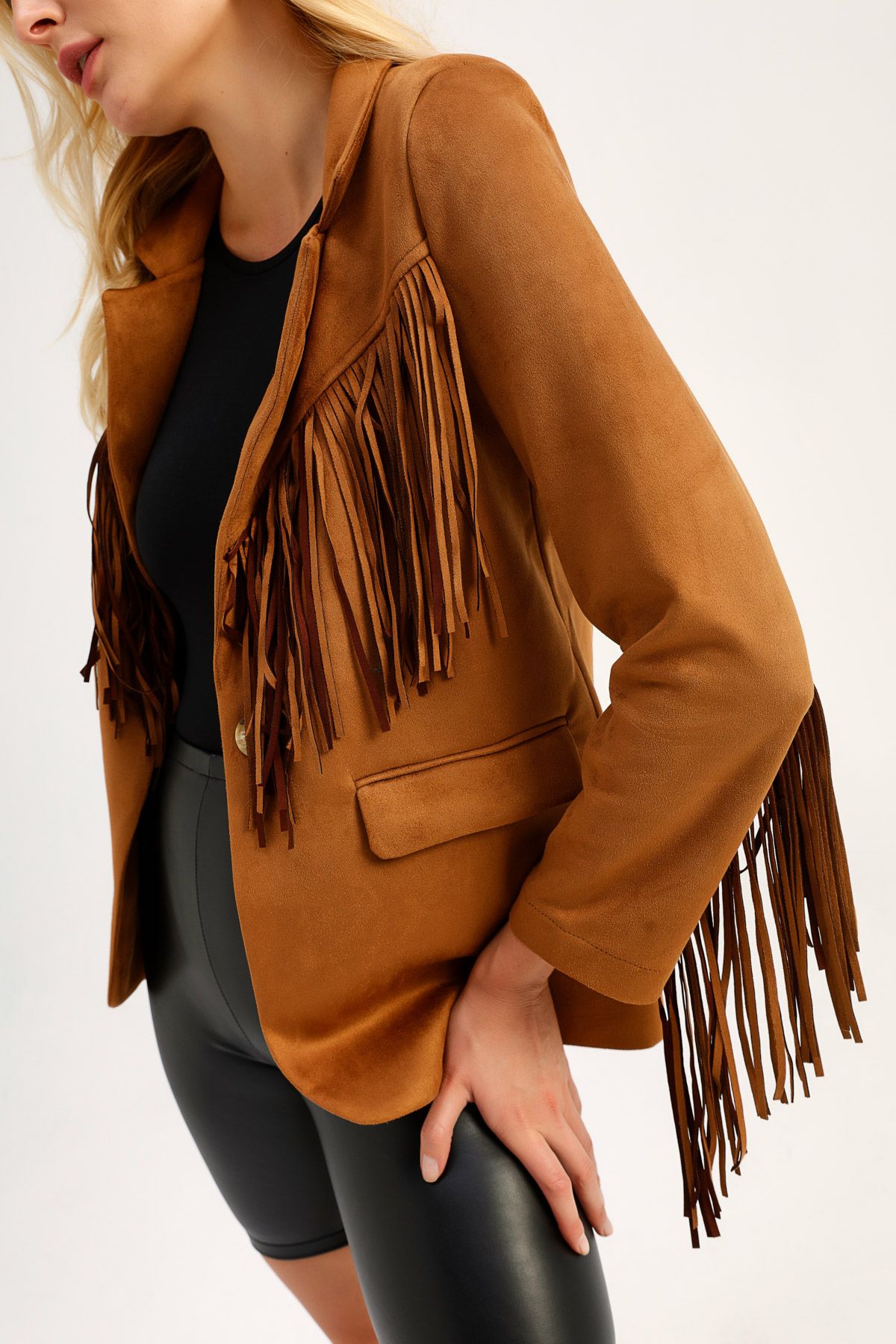 What can we say about the tasseled suede blazer jacket model! The vegan suede jacket with nature-friendly tassels, which will make you stand out in every environment you enter, invites you to basic pieces for magnificent combinations! While adding movement to your life, don't forget to protect nature and animals by using vegan pieces!