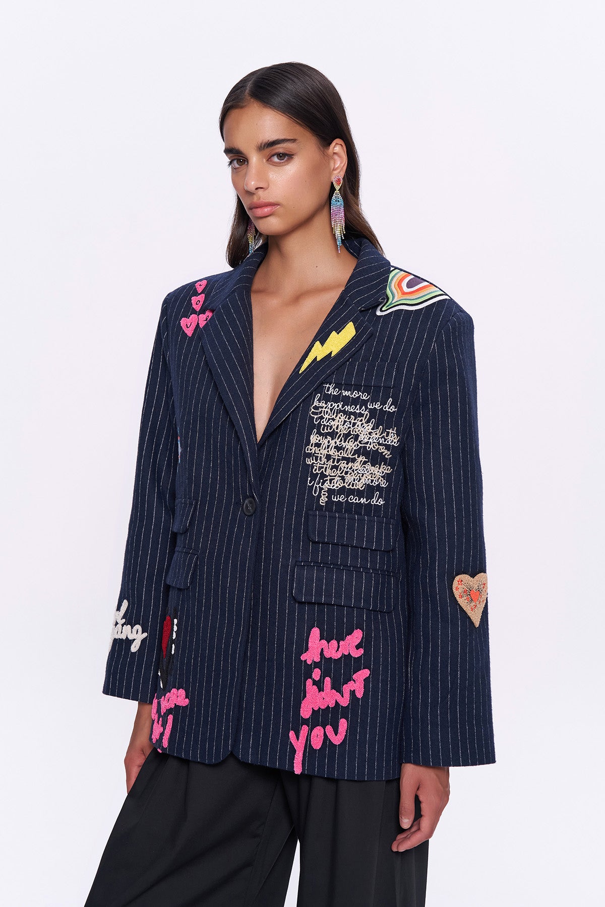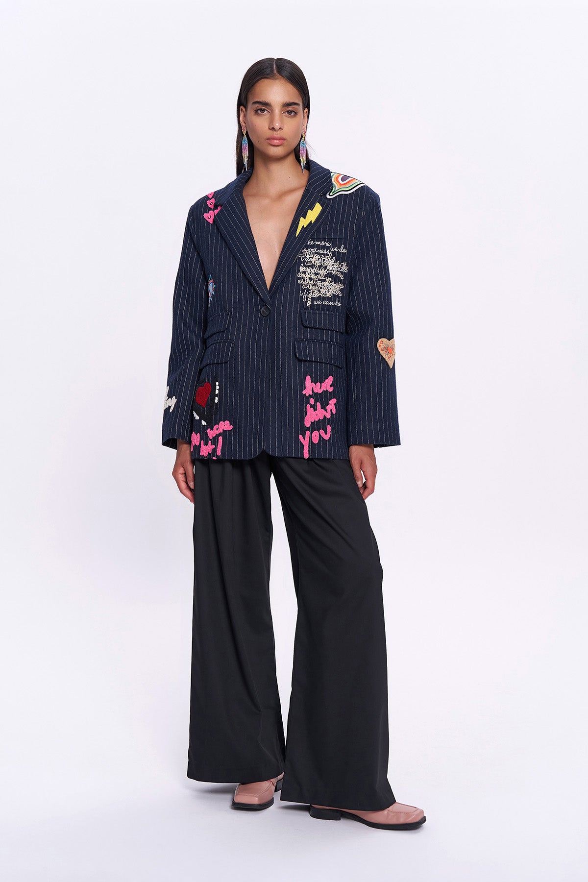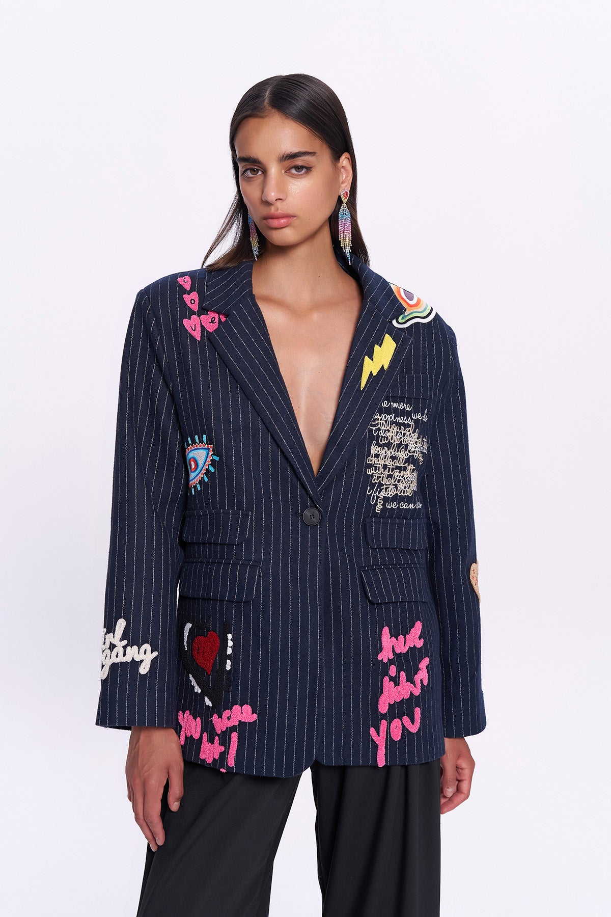 Çizgili desenli, içi astarlı, renkli nakış ve yazı detaylı, kaşe blazer ceket.